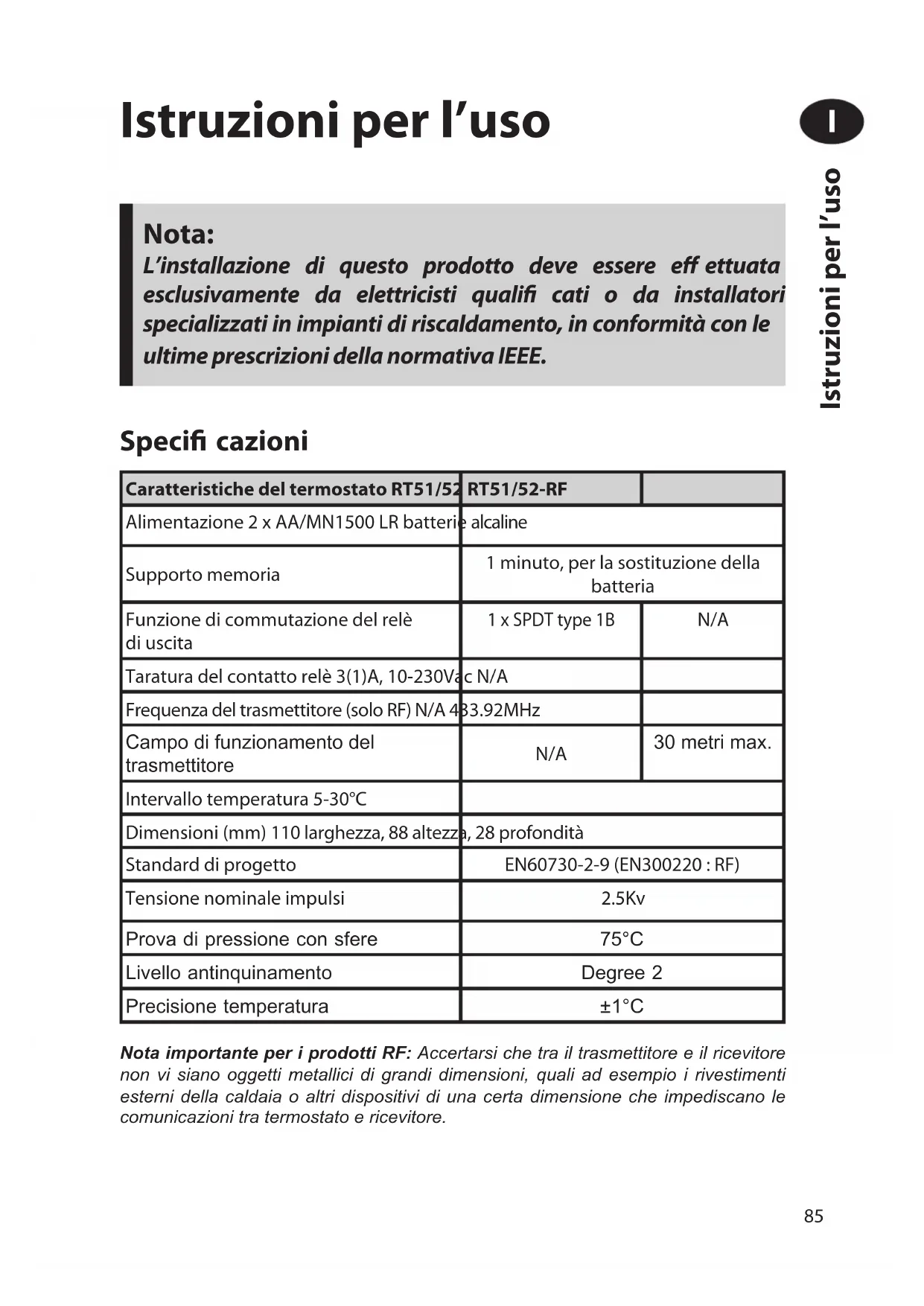 Informacija Vartotojui LT85 Istruzioni per l’uso Nota importante per i prodotti RF: Accertarsi che tra il trasmettitore e il ricevitore non vi siano oggetti metallici di grandi dimensioni, quali ad esempio i rivestimenti esterni della caldaia o altri dispositivi di una certa dimensione che impediscano le comunicazioni tra termostato e ricevitore. Speci cazioni Nota: L’installazione di questo prodotto deve essere e ettuata esclusivamente da elettricisti quali cati o da installatori specializzati in impianti di riscaldamento, in conformità con le ultime prescrizioni della normativa IEEE. Caratteristiche del termostato RT51/52 RT51/52-RF Alimentazione 2 x AA/MN1500 LR batterie alcaline Supporto memoria 1 minuto, per la sostituzione della batteria Funzione di commutazione del relè di uscita 1 x SPDT type 1B N/A Taratura del contatto relè 3(1)A, 10-230Vac N/A Frequenza del trasmettitore (solo RF) N/A 433.92MHz Campo di funzionamento del trasmettitore N/A 30 metri max. Intervallo temperatura 5-30°C Dimensioni (mm) 110 larghezza, 88 altezza, 28 profondità Standard di progetto EN60730-2-9 (EN300220 : RF) Tensione nominale impulsi 2.5Kv Prova di pressione con sfere 75°C Livello antinquinamento Degree 2 Precisione temperatura ±1°C Istruzioni per l’uso I86 Installazione Rimuovere innanzitutto la piastra a parete dal retro dell’unità. Per il montaggio del modulo plug-in, è necessario che in corrispondenza dell’angolo superiore sinistro della piastra sia disponibile uno spazio libero di almeno 140 mm verso destra, 15 mm verso sinistra, 30 mm verso l’alto e 100 mm verso il basso.