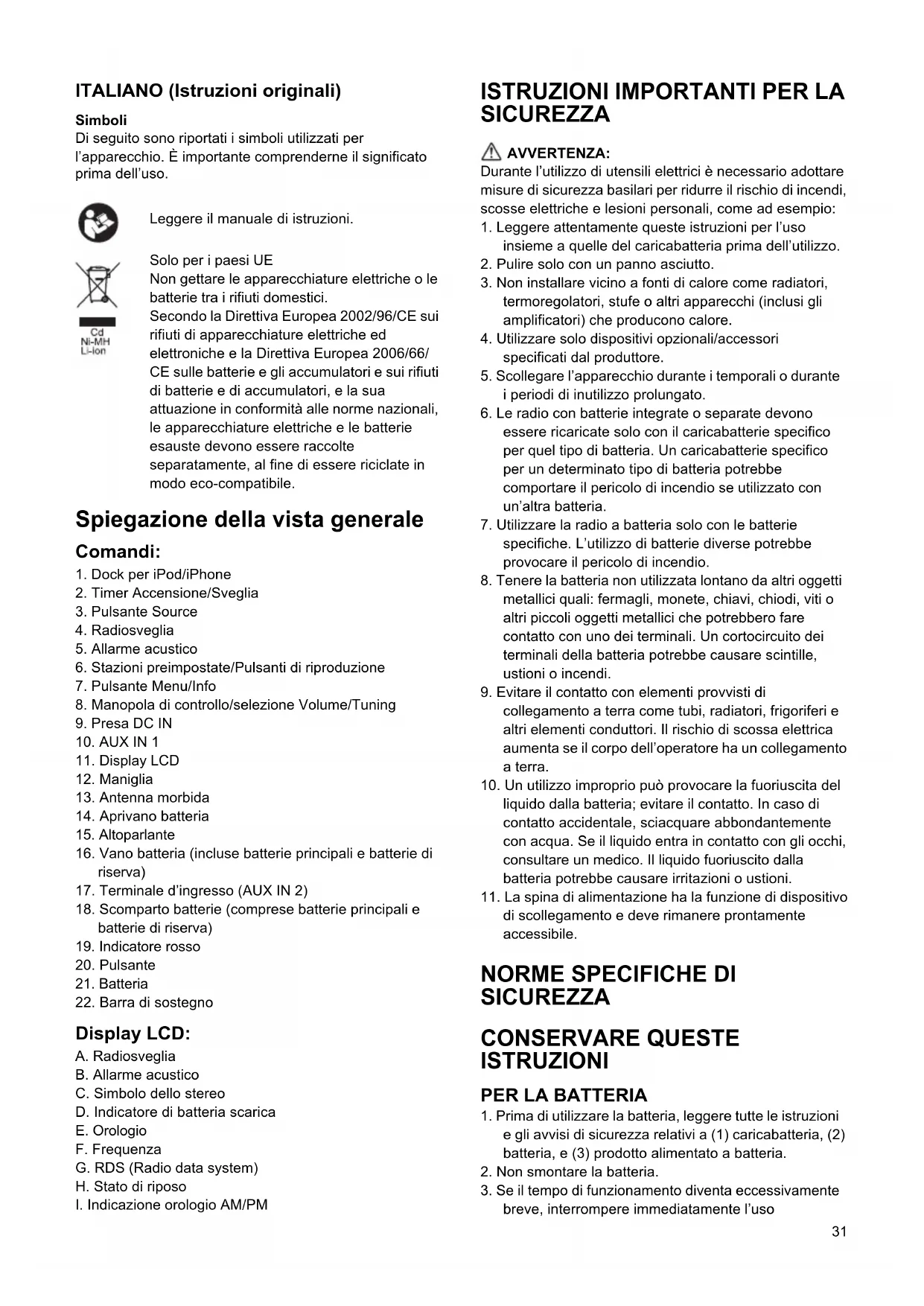 iPhone, iPod, iPod classic, iPod shuffle e iPod touch sono marchi commerciali di Apple Inc. registrati negli Stati Uniti e in altri Paesi. “Made for iPod” e “Made for iPhone” indica un accessorio elettronico appositamente progettato per la connessione con iPod o iPhone, rispettivamente, e certificato dal produttore per soddisfare gli standard prestazionali di Apple. Apple non è responsabile per il funzionamento del dispositivo o la sua conformità agli standard normativi e di sicurezza. L’utilizzo del presente accessorio con iPod o iPhone potrebbe influire sulle prestazioni wireless. Installazione della batteria Nota: Se si conservano le batterie di riserva nell’apposito scomparto si evita la perdita dei dati memorizzati nelle memorie preimpostate.