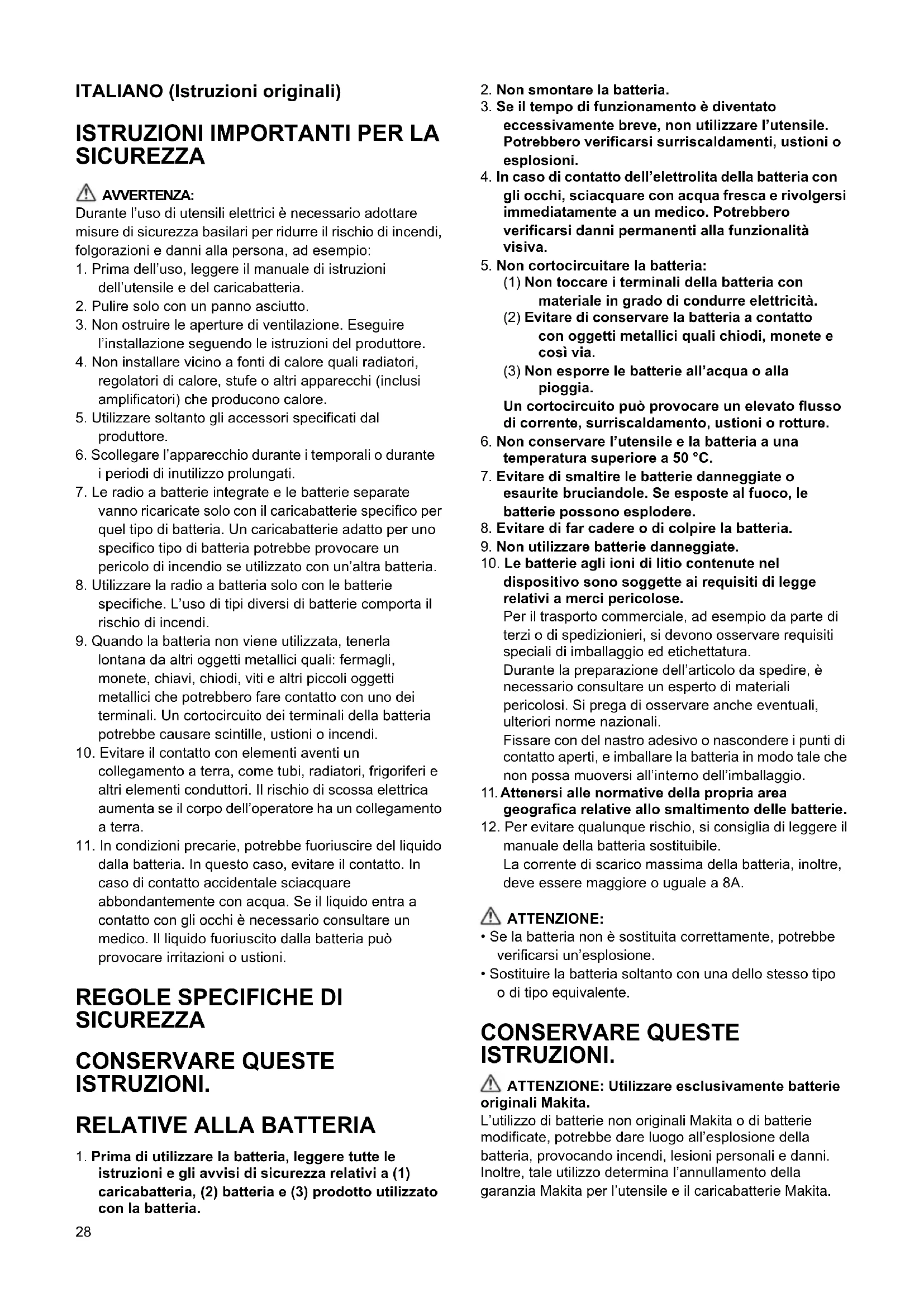 - Sostituire la batteria soltanto con una dello stesso tipo o di tipo equivalente. CONSERVARE QUESTE ISTRUZIONI. ATTENZIONE: Utilizzare esclusivamente batterie originali Makita. L’utilizzo di batterie non originali Makita o di batterie modificate, potrebbe dare luogo all’esplosione della batteria, provocando incendi, lesioni personali e danni. Inoltre, tale utilizzo determina l’annullamento della garanzia Makita per l’utensile e il caricabatterie Makita.29 Suggerimenti per il prolungamento della durata della batteria