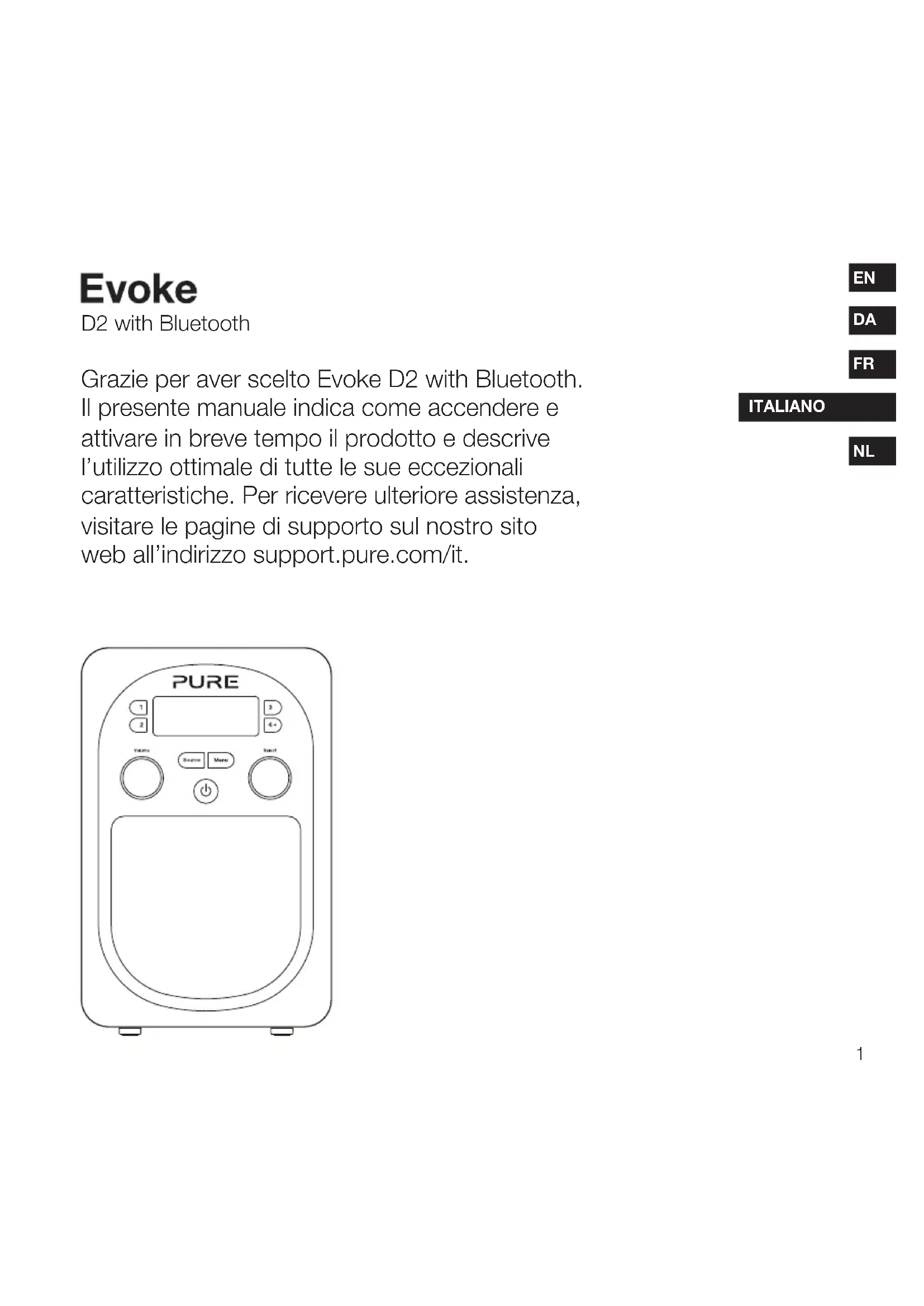 ITALIANO Grazie per aver scelto Evoke D2 with Bluetooth. Il presente manuale indica come accendere e attivare in breve tempo il prodotto e descrive l’utilizzo ottimale di tutte le sue eccezionali caratteristiche. Per ricevere ulteriore assistenza, visitare le pagine di supporto sul nostro sito web all’indirizzo support.pure.com/it. D2 with Bluetooth DA2 Informazioni di sicurezza