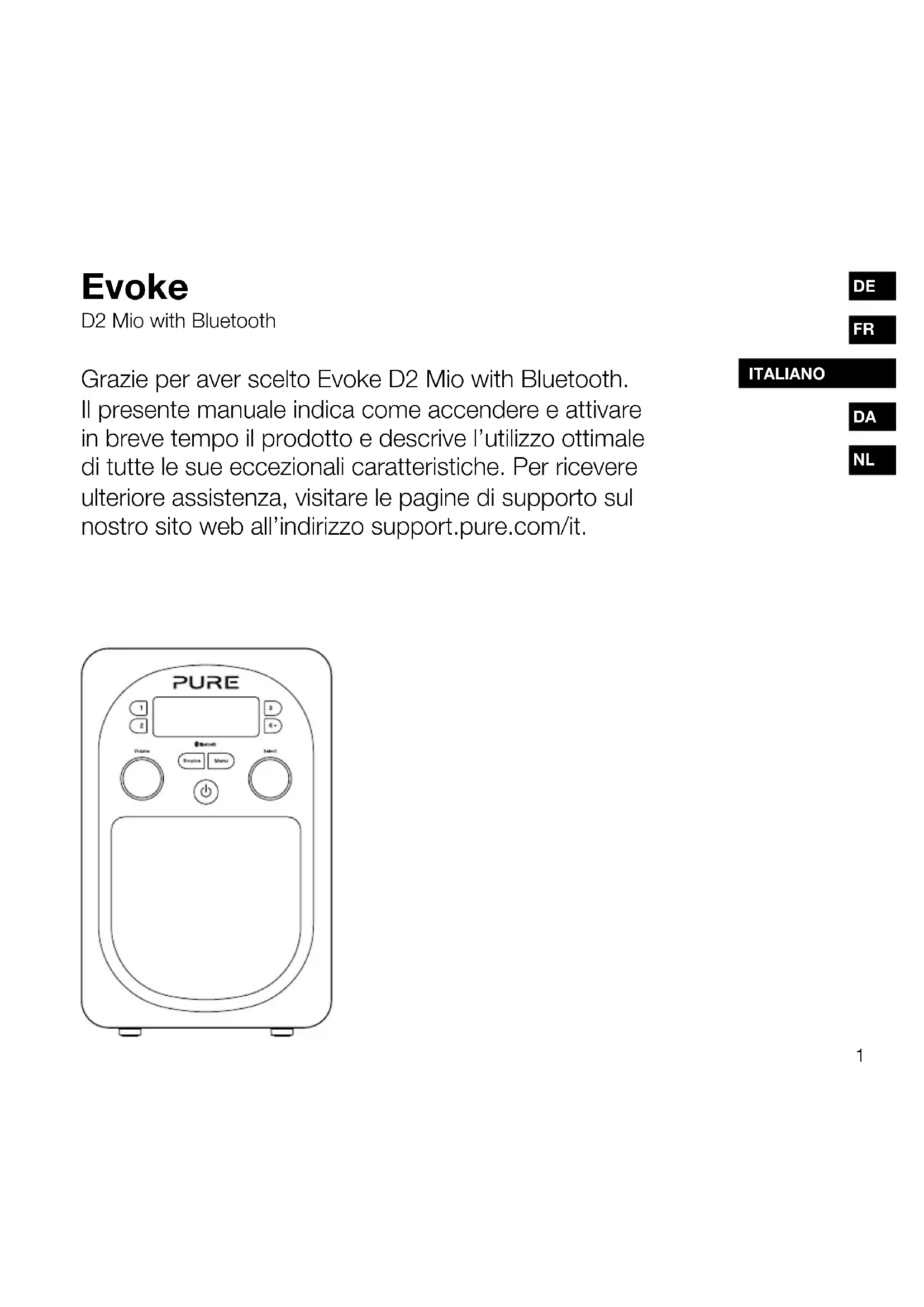 Grazie per aver scelto Evoke D2 Mio with Bluetooth. Il presente manuale indica come accendere e attivare in breve tempo il prodotto e descrive l’utilizzo ottimale di tutte le sue eccezionali caratteristiche. Per ricevere ulteriore assistenza, visitare le pagine di supporto sul nostro sito web all’indirizzo support.pure.com/it. D2 Mio with Bluetooth Evoke Evoke_D2_Bluetooth_Mio-Euro.indb 1 6/11/2014 12:10:54 PM2 Informazioni di sicurezza