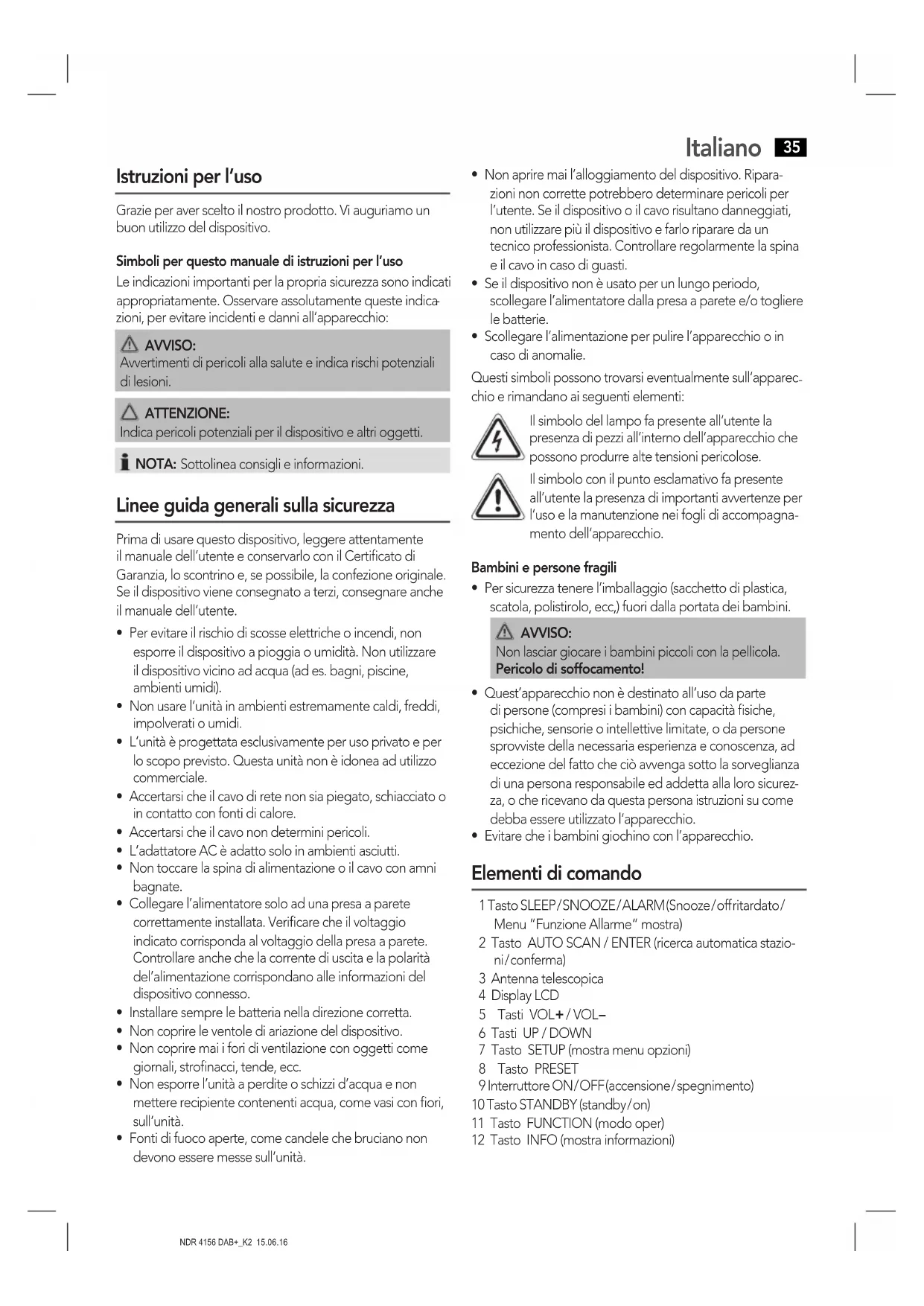 - Evitare che i bambini giochino con l’apparecchio. Elementi di comando 1 Tasto SLEEP / SNOOZE / ALARM (Snooze / off ritardato / Menu “Funzione Allarme“ mostra) 2 Tasto AUTO SCAN / ENTER (ricerca automatica stazio- ni / conferma) 3 Antenna telescopica 4 Display LCD 5 Tasti VOL + / VOL – 6 Tasti UP/ DOWN 7 Tasto SETUP (mostra menu opzioni) 8 Tasto PRESET 9 Interruttore ON / OFF (accensione / spegnimento) 10 Tasto STANDBY (standby / on) 11 Tasto FUNCTION (modo oper) 12 Tasto INFO (mostra informazioni)36 Italiano