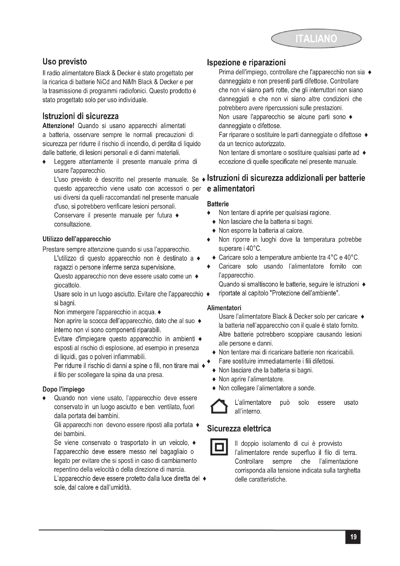 Scarica le istruzioni per il tuo Radio in formato PDF gratuitamente! Trova il tuo manuale BD18RC T1 - BLACK & DECKER e riprendi in mano il tuo dispositivo elettronico. In questa pagina sono pubblicati tutti i documenti necessari per l'utilizzo del tuo dispositivo. BD18RC T1 del marchio BLACK & DECKER.