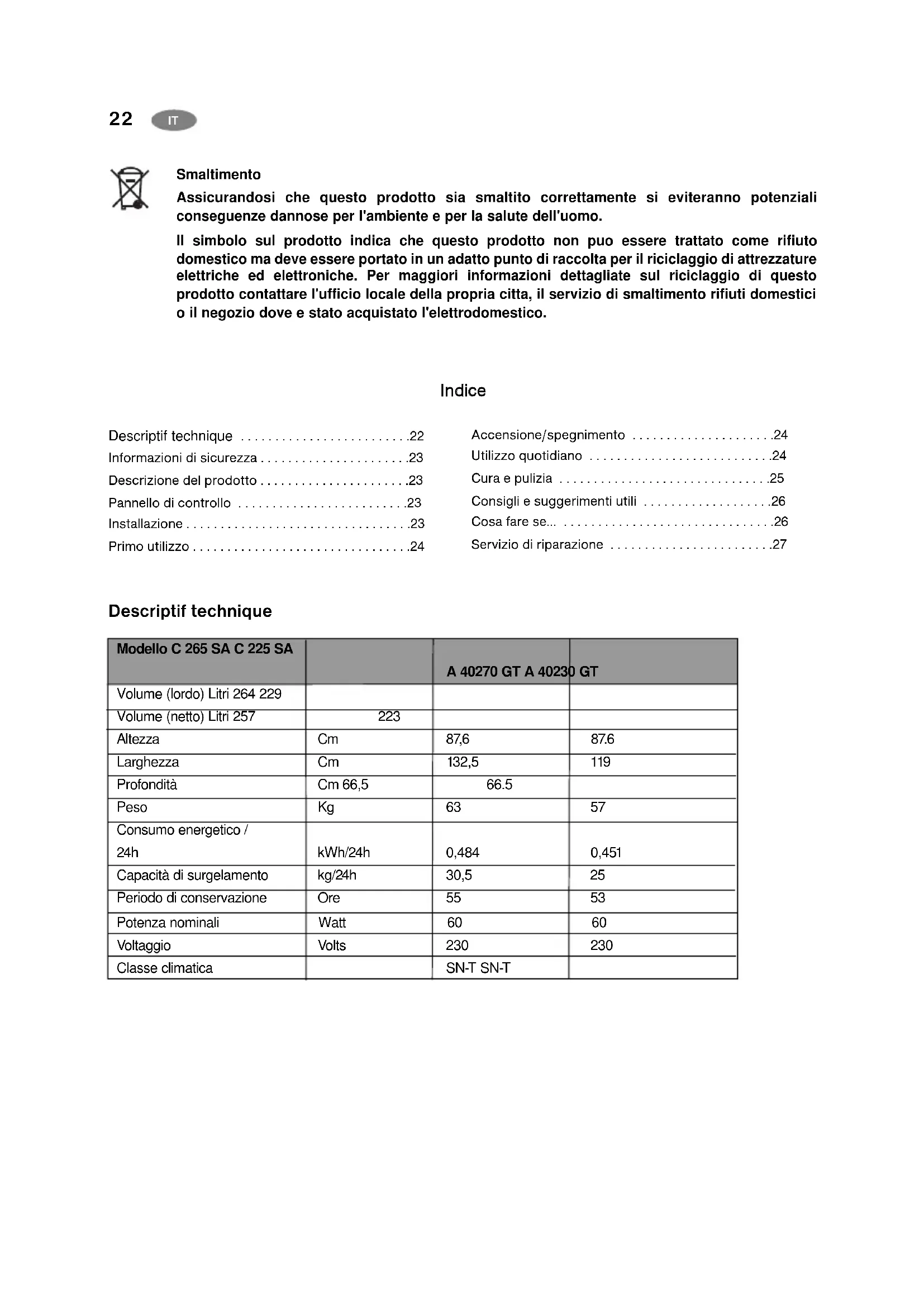 - Servizio di riparazione Descriptif technique Modello C 265 SA C 225 SA A 40270 GT A 40230 GT Volume (lordo) Litri 264 229 Volume (netto) Litri 257 223 Altezza Cm 87,6 87.6 Larghezza Cm 132,5 119 Profondità Cm 66,5 66.5 Peso Kg 63 57 Consumo energetico / 24h kWh/24h 0,484 0,451 Capacità di surgelamento kg/24h 30,5 25 Periodo di conservazione Ore 55 53 Potenza nominali Watt 60 60 Voltaggio Volts 230 230 Classe climatica SN-T SN-T23 p. 27