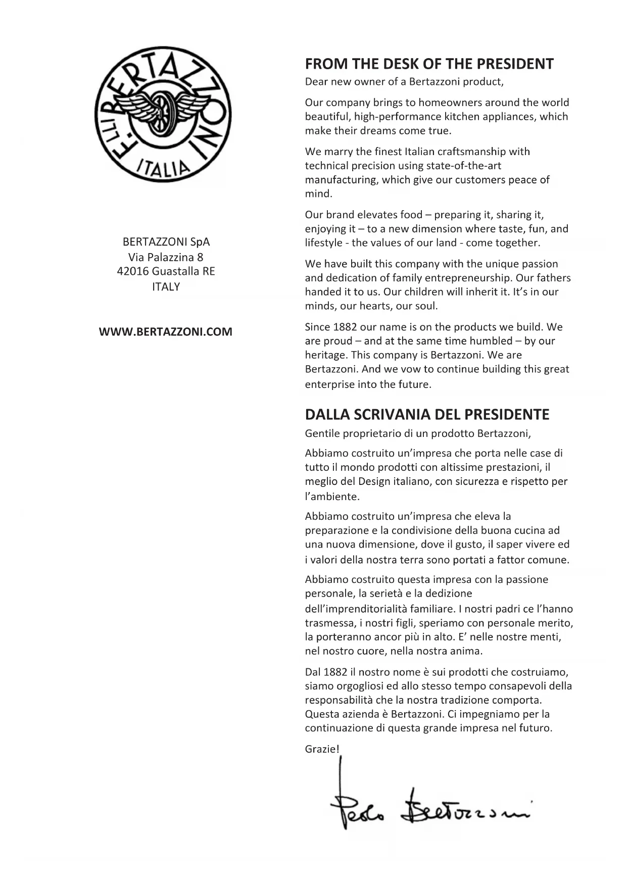 Dal 1882 il nostro nome è sui prodotti che costruiamo, siamo orgogliosi ed allo stesso tempo consapevoli della responsabilità che la nostra tradizione comporta. Questa azienda è Bertazzoni. Ci impegniamo per la continuazione di这一点a grande impresa nel futuro.