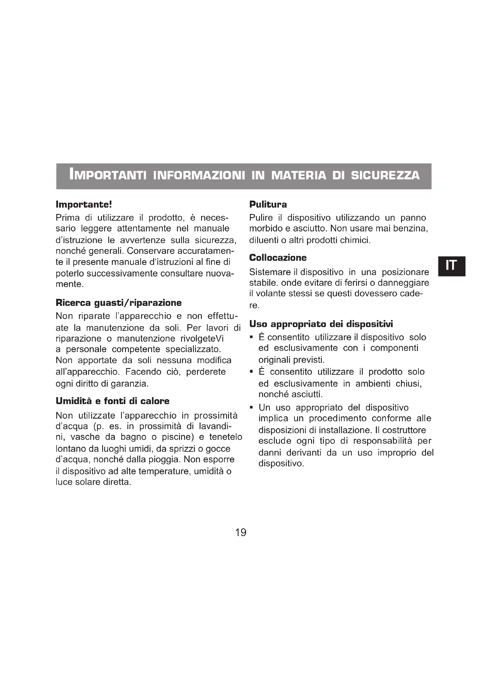 - É consentito utilizzato il prodotto solo ed escludivamente in ambienti chiusi, nonché asciutti.