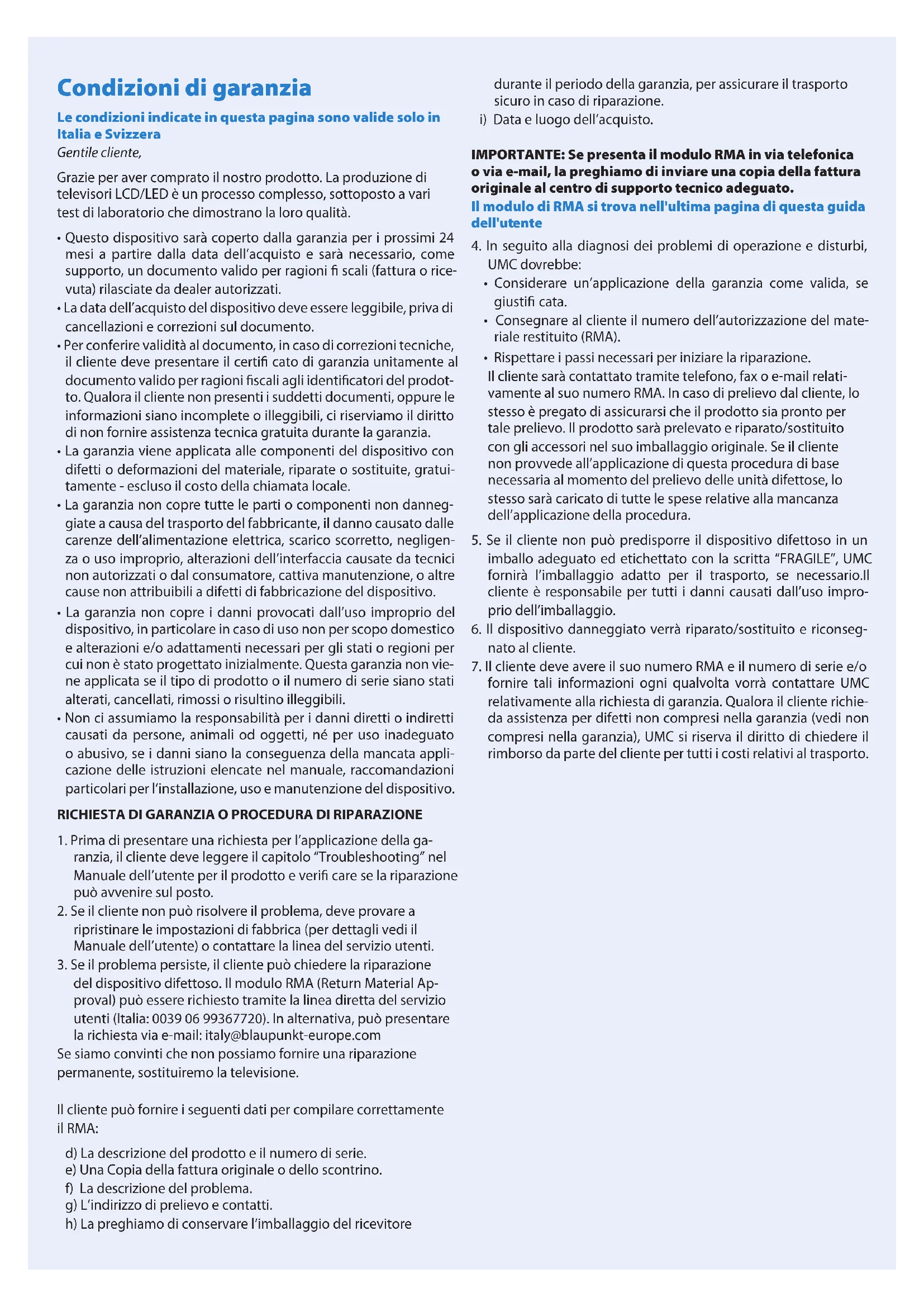 - Se il problema persististe, il cliente può chiedere la riparazione del dispositivo difettoso. Il modulo RMA (Return Material Approval) può essere richiestotramite la linea diretta del servizio utenti (Italia: 0039 06 99367720). In alternatively, può presentare la richiesta via e-mail: italy@blaupunkt-europe.com