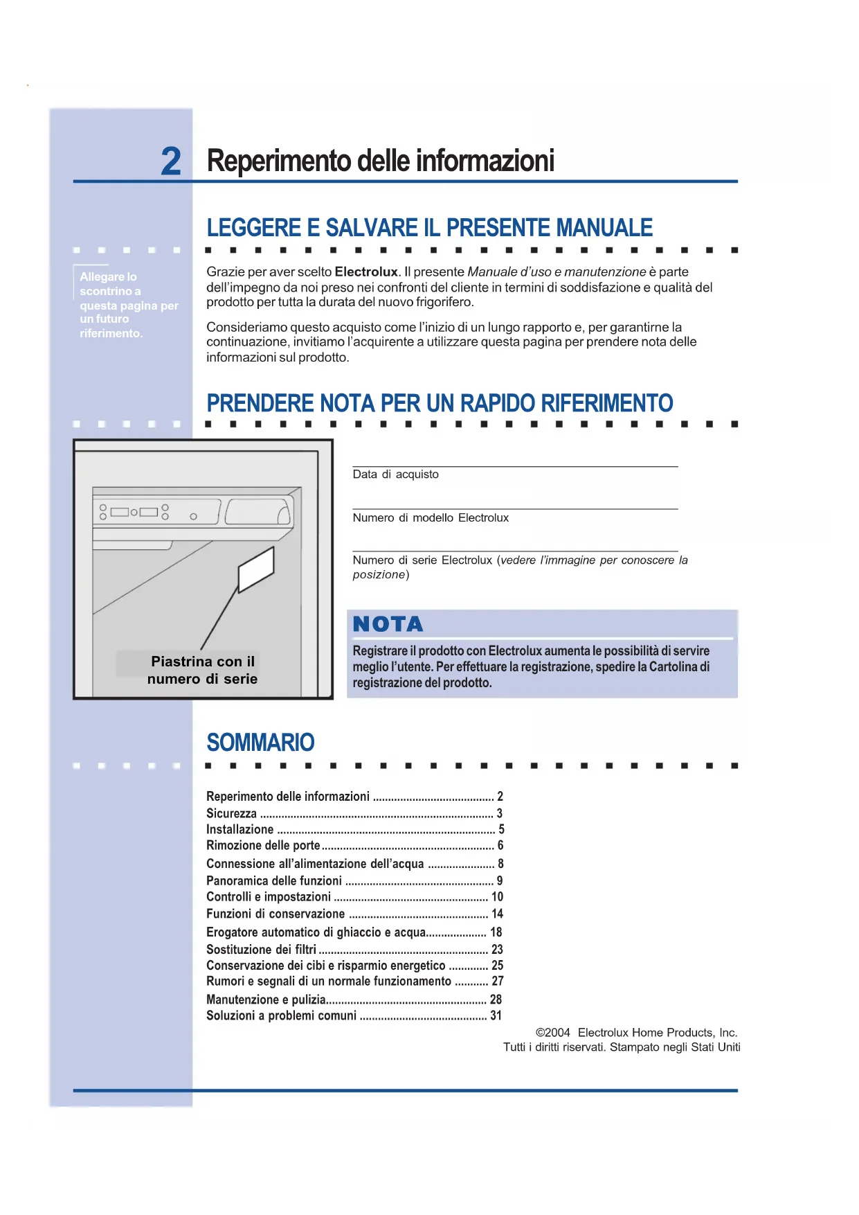- Registrare il prodotto con Electrolux aumenta le possibilità di serviremeglio l’utente. Per effettuare la registrazione, spedire la Cartolina diregistrazione del prodotto.Allegare loscontrino aquesta pagina perun futuroriferimento. SOMMARIO Reperimento delle informazioni p. 2