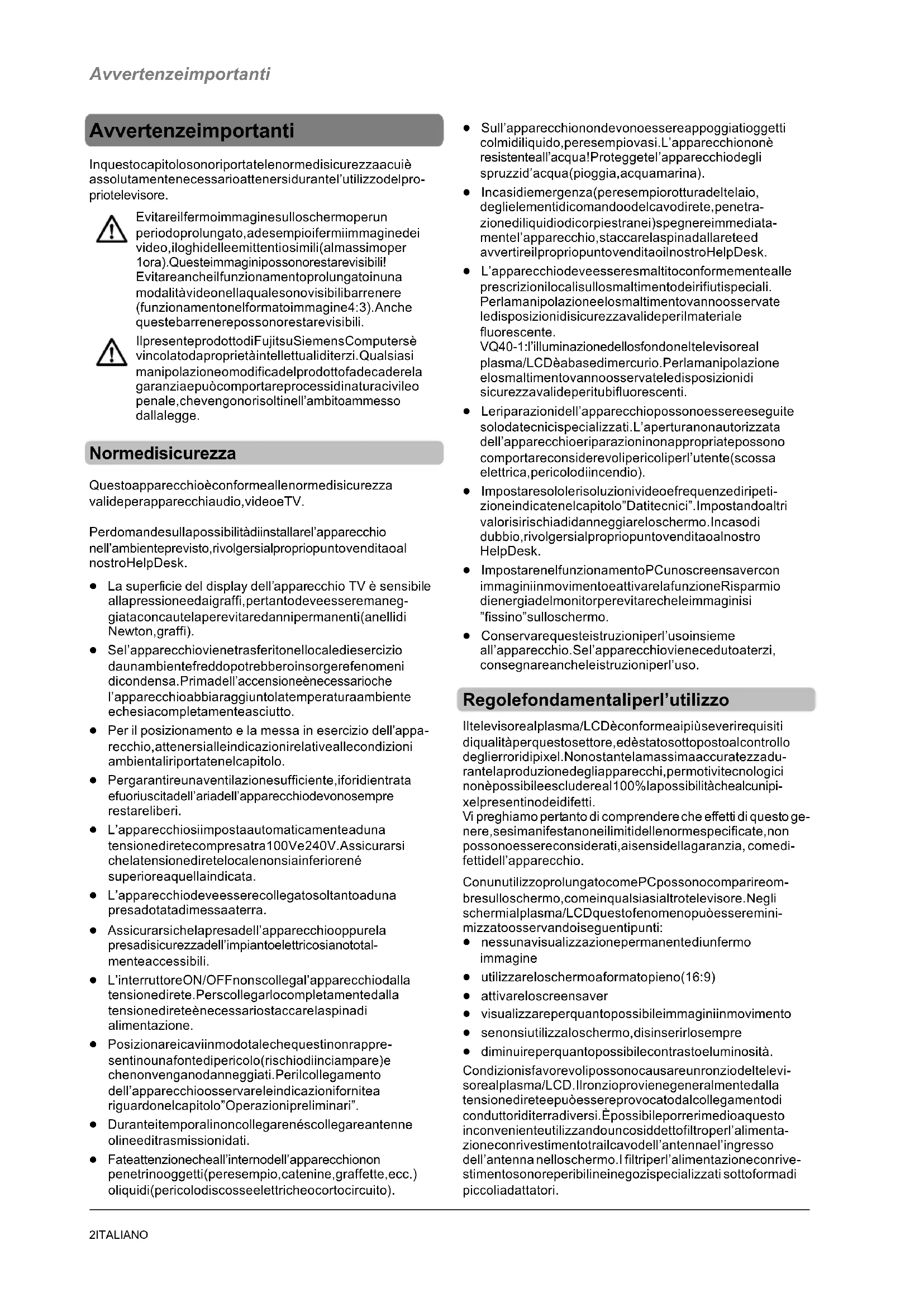 Appareil avec pied h x l x p : Appareil sans pied h x l x p : (792,3 mm x 1228 mm x 269,2 mm) ± 3 mm (758,9 mm x 1228 mm x 107,7 mm) ± 3 mm Poids de l’appareil : Poids du pied : Poids total : 46,3 kg ± 10% 3,0 kg ± 10% 49,3 kg ± 10% FRANÇAISIndice 1ITALIANO Avvertenze importanti 2.......................... Norme di sicurezza 2........................... Regole fondamentali per l’utilizzo 2............... Smaltimento e riciclaggio 3...................... Pulizia 3...................................... Pulizia dello schermo 3...................... Pulizia del case 3........................... Conformità 3.................................. In caso di malfunzionamenti 3.................... Batterie 3..................................... Panoramica 4.................................... Dotazione 4................................... Collegamenti 5................................ Telecomando 6................................ Elementi di comando sull’apparecchio 7........... Operazioni preliminari 8.......................... Direzione di osservazione 8.................. Luogo di installazione 8...................... Installazione 8.............................. Montaggio a parete 8........................ Sagome per foratura 9....................... Collegamento di un’antenna 10................ Inserimento delle batterie nel telecomando 10.... Utilizzo del telecomando 10.................... Collegamento del cavo di rete 10............... Prima inst allazione 11............................ Impostazione della lingua 11................... Selezione del paese per l’ordine di ricerca 11.... Comando 12...................................... Accensione/spegnimento 12................... Cambio di canali (cambio programma) 12........ Impostazione del volume e del suono 12........ Utilizzo della funzione Immagine nell’immagine 13 Possibilità di combinazione della fonte principale con l’Ingresso PIP 14................ Fermo immagine 14.......................... Sleep Timer 14.............................. Comando a menu OSD 15....................... Impostazioni base 15............................ Ricerca automatica delle emittenti 15........... Ricerca manuale delle emittenti 16............. Modificare il nome del canale 16............... Impostazione del decoder 17.................. Gestione sommario programmi 17.............. Impostazioni OSD 18............................ Impostazioni dell’immagine 19.................... Per le fonti AV (TV, CVBS, YC, YUV, SCART1, SCART2, HDMI) 19.......................... Per fonti PC (RGB, DVI) 20.................... Formati immagine per fonti AV 21............... Formati immagine per fonti PC 22.............. Impostazioni del suono avanzate 22............... Equalizzatore utente 23....................... Televideo 24.................................... Collegamento apparecchi esterni 25............... Collegamento a SCART1 / SCART2 25......... Collegamento agli ingressi component YUV 26... Collegamento all’ingresso video S 26........... Collegamento all’ingresso HDMI 27............. Collegamento all’ingresso DVI-I del PC 27....... Impostazioni per il PC (RGB) 27............. Impostazioni per il PC(DVI) 28.............. Selezionare ingressi 28....................... Funzioni speciali 29............................. Screensaver Solo televisore al plasma! 29....... Eliminazione degli errori 30........................ Dati tecnici - MYRICA VQ40-1 31.................... Dati tecnici - MYRICA PQ42-1 32.................... Dati tecnici - MYRICA PQ50-1 33.................... ITALIANOAvvertenze importanti 2 ITALIANO Avvertenze importanti In questo capitolo sono riportate le norme di sicurezza a cui è assolutamente necessario attenersi durante l’utilizzo del pro- prio televisore. Evitare il fermo immagine sullo schermo per un periodo prolungato, ad esempio i fermi immagine dei video, i loghi delle emittenti o simili (al massimo per 1 ora). Queste immagini possono restare visibili! Evitare anche il funzionamento prolungato in una modalità video nella quale sono visibili barre nere (funzionamento nel formato immagine 4:3). Anche queste barre nere possono restare visibili. Il presente prodotto di Fujitsu Siemens Computers è vincolato da proprietà intellettuali di terzi. Qualsiasi manipolazione o modifica del prodotto fa decadere la garanzia e può comportare processi di natura c ivile o penale, che vengono risolti nell’ambito ammesso dalla legge. Norme di sicurezza Questo apparecchio è conforme alle norme di sicurezza valide per apparecchi audio, video e TV. Per domande sulla possibilità di inst allare l’apparecchio nell’ambiente previsto, rivolgersi al proprio punto vendita o al nostro Help Desk. D La superficie del display dell’apparecchio TV è s ensibile alla pressione ed ai graffi, pertanto deve essere maneg- giata c on cautela per evitare danni permanenti (anelli di Newton, graffi). D Se l’apparecchio viene trasferito nel locale di esercizio da un ambiente freddo potrebbero insorgere fenomeni di condensa. Prima de ll’accensione è necessario che l’apparecchio abbia raggiunto la temperatura ambiente e che sia completamente asciutto. D Per il posizionamento e la messa in esercizio dell’appa- recchio, attenersi alle indicazioni relative alle condizioni ambientali riportate nel capitolo. D Per garantire una ventilazione sufficiente, i fori di entrata e fuoriuscita dell’aria dell’apparecchio devono sempre restare liberi. D L’apparecchio si imposta automaticamente ad una tensione di rete compresa tra 100 V e 240 V. Assicurarsi che la tensione di rete locale non sia inferiore né superiore a quella indicata. D L’apparecchio deve essere collegato soltanto ad una presa dotata di messa a terra. D Assicurarsi che la presa dell’apparecchio oppure la presa di sicurezza dell’impianto elettrico siano total- mente accessibili. D L’interruttore ON/OFF non scollega l’apparecchio dalla tensione di rete. Per scollegarlo comp