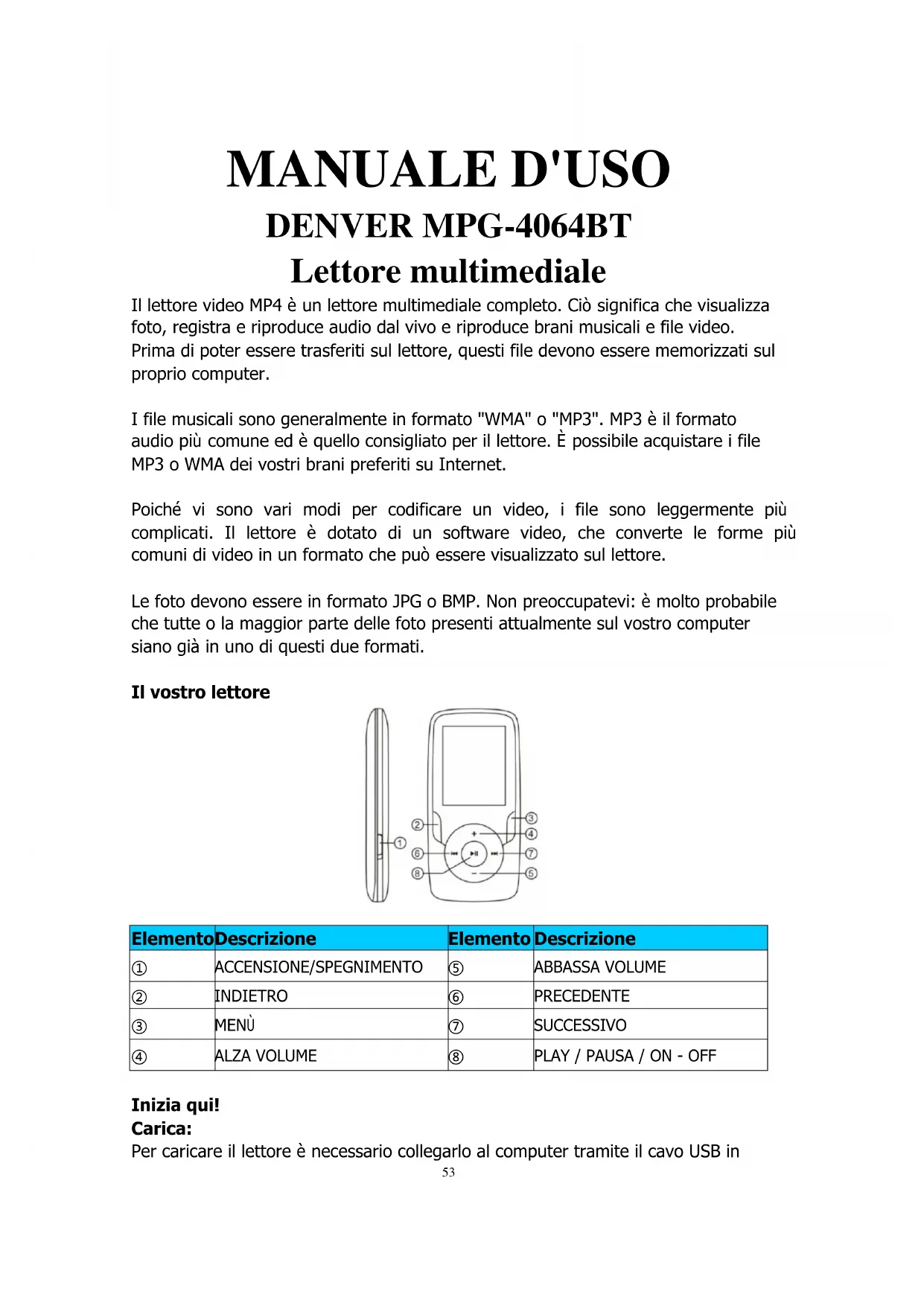 Scarica le istruzioni per il tuo Lettore mp3 in formato PDF gratuitamente! Trova il tuo manuale MPG4064BT - DENVER e riprendi in mano il tuo dispositivo elettronico. In questa pagina sono pubblicati tutti i documenti necessari per l'utilizzo del tuo dispositivo. MPG4064BT del marchio DENVER.