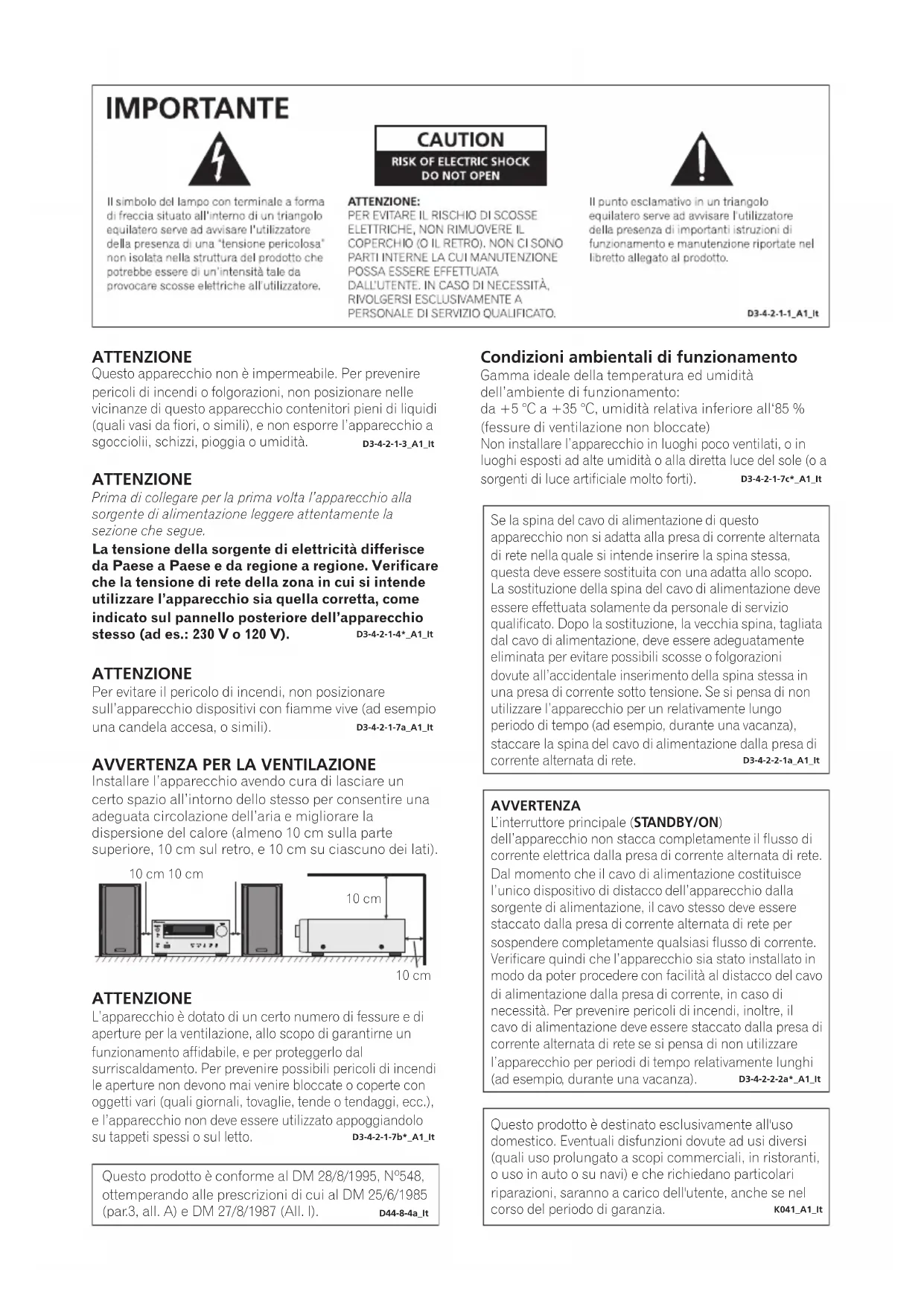Installare l’apparecchio avendo cura di lasciare un certo spazio all’intorno dello stesso per consentire una adeguata circolazione dell’aria e migliorare la dispersione del calore (almeno 10 cm sulla parte superiore, 10 cm sul retro, e 10 cm su ciascuno dei lati). ATTENZIONE L’apparecchio è dotato di un certo numero di fessure e di aperture per la ventilazione, allo scopo di garantirne un funzionamento affidabile, e per proteggerlo dal surriscaldamento. Per prevenire possibili pericoli di incendi le aperture non devono mai venire bloccate o coperte con oggetti vari (quali giornali, tovaglie, tende o tendaggi, ecc.), e l’apparecchio non deve essere utilizzato appoggiandolo su tappeti spessi o sul letto. D3-4-2-1-7b*_A1_It 10 cm 10 cm 10 cm 10 cm Se la spina del cavo di alimentazione di questo apparecchio non si adatta alla presa di corrente alternata di rete nella quale si intende inserire la spina stessa, questa deve essere sostituita con una adatta allo scopo . La sostituzione della spina del cavo di alimentazione deve essere effettuata solamente da personale di ser vizio qualificato. Dopo la sostituzione, la vecchia spina, tagliata dal cavo di alimentazione, deve essere adeguatamente eliminata per evitare possibili scosse o folgorazioni dovute all’accidentale inserimento della spina stessa in una presa di corrente sotto tensione. Se si pensa di non utilizzare l’apparecchio per un relativamente lungo periodo di tempo (ad esempio , durante una vacanza), staccare la spina del cavo di alimentazione dalla presa di corrente alternata di rete. D3-4-2-2-1a_A1_It AVVERTENZA L’interruttore principale (STANDBY/ON) dell’apparecchio non stacca completamente il flusso di corrente elettrica dalla presa di corrente alternata di rete. Dal momento che il cavo di alimentazione costituisce l’unico dispositivo di distacco dell’apparecchio dalla sorgente di alimentazione, il cavo stesso deve essere staccato dalla presa di corrente alternata di rete per sospendere completamente qualsiasi flusso di corrente. Verificare quindi che l’apparecchio sia stato installato in modo da poter procedere con facilità al distacco del cavo di alimentazione dalla presa di corrente, in caso di necessità. Pe r prevenire pericoli di incendi, inoltre, il cavo di alimentazione deve essere staccato dalla presa di corrente alternata di rete se si pensa di non utilizzare l’apparecchio per periodi di tempo relativamente lunghi (ad esempio , durante una vacanza). D3-4-2-2-2a*_A1_It Condizioni ambientali di funzionamento Gamma ideale della temperatura ed umidità dell’ambiente di funzionamento: da +5 °C a +35 °C, umidità relativa inferiore all‘85 % (fessure di ventilazione non bloccate) Non installare l’apparecchio in luoghi poco ventilati, o in luoghi esposti ad alte umidità o alla diretta luce del sole (o a sorgenti di luce artificiale molto forti). D3-4-2-1-7c*_A1_It Questo prodotto è destinato esclusivamente all'uso domestico. Eventuali disfunzioni dovute ad usi diversi (quali uso prolungato a scopi commerciali, in ristoranti, o uso in auto o su navi) e che richiedano particolari riparazioni, saranno a carico dell'utente, anche se nel corso del periodo di garanzia. K041_A1_It Questo prodotto è conforme al DM 28/8/1995, Nº548, ottemperando alle prescrizioni di cui al DM 25/6/1985 (par.3, all. A) e DM 27/8/1987 (All. I). D44-8-4a_It11/5/25 X-HM10_20_Anki_It.fm I-3