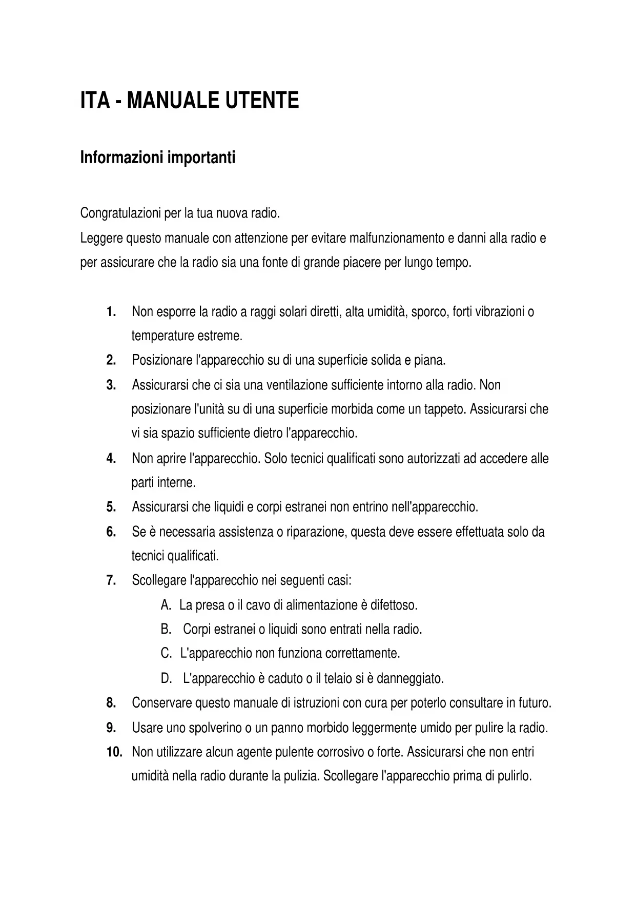 Caratteristiche tecniche ............................................................................. 113ITA - MANUALE UTENTE Informazioni importanti Congratulazioni per la tua nuova radio. Leggere questo manuale con attenzione per evitare malfunzionamento e danni alla radio e per assicurare che la radio sia una fonte di grande piacere per lungo tempo.
