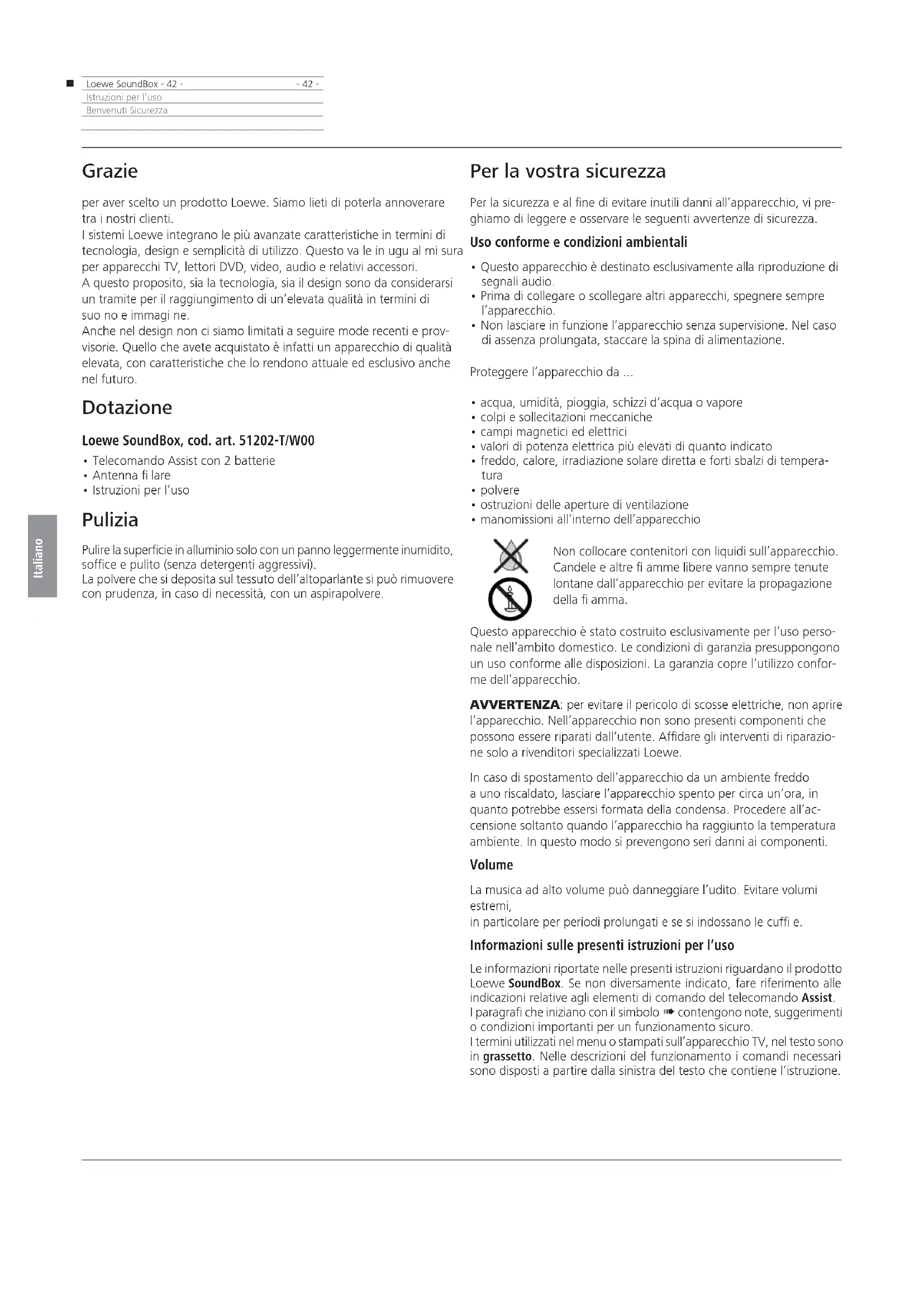 - 42 -Istruzioni per l’usoBenvenuti Sicurezza Grazie per aver scelto un prodotto Loewe. Siamo lieti di poterla annoverare tra i nostri clienti. I sistemi Loewe integrano le più avanzate caratteristiche in termini di tecnologia, design e semplicità di utilizzo. Questo va le in ugu al mi sura per apparecchi TV, lettori DVD, video, audio e relativi accessori. A questo proposito, sia la tecnologia, sia il design sono da considerarsi un tramite per il raggiungimento di un’elevata qualità in termini di suo no e immagi ne. Anche nel design non ci siamo limitati a seguire mode recenti e prov- visorie. Quello che avete acquistato è infatti un apparecchio di qualità elevata, con caratteristiche che lo rendono attuale ed esclusivo anche nel futuro. Dotazione Loewe SoundBox, cod. art. 51202-T/W00