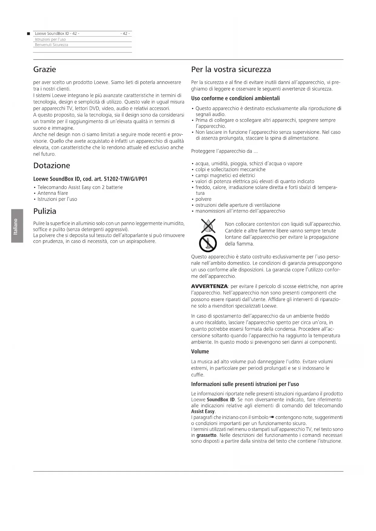 - 42 -Istruzioni per l’usoBenvenuti Sicurezza Grazie per aver scelto un prodotto Loewe. Siamo lieti di poterla annoverare tra i nostri clienti. I sistemi Loewe integrano le più avanzate caratteristiche in termini di tecnologia, design e semplicità di utilizzo. Questo vale in ugual misura per apparecchi TV, lettori DVD, video, audio e relativi accessori. A questo proposito, sia la tecnologia, sia il design sono da considerarsi un tramite per il raggiungimento di un’elevata qualità in termini di suono e immagine. Anche nel design non ci siamo limitati a seguire mode recenti e prov- visorie. Quello che avete acquistato è infatti un apparecchio di qualità elevata, con caratteristiche che lo rendono attuale ed esclusivo anche nel futuro. Dotazione Loewe SoundBox ID, cod. art. 51202-T/W/G/I/P01