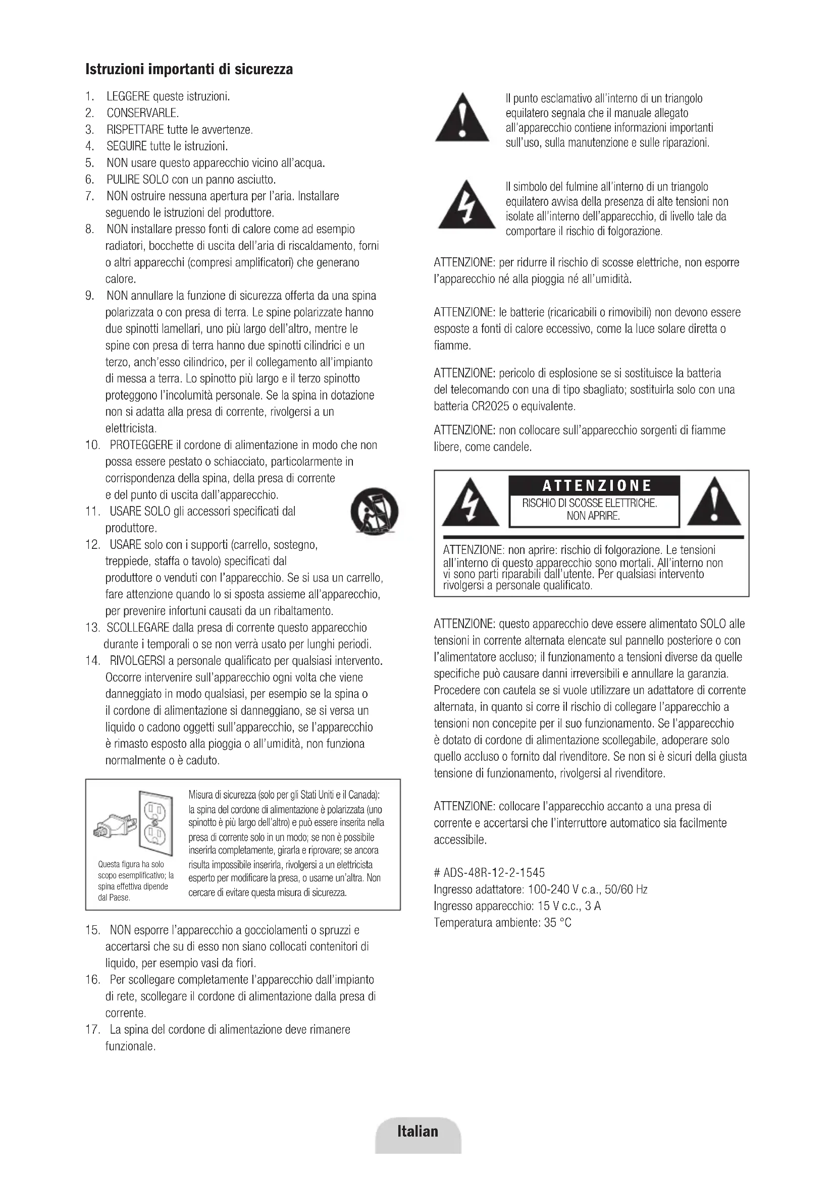 RoomGrooveMisura di sicurezza (solo per gli Stati Uniti e il Canada): la spina del cordone di alimentazione è polarizzata (uno spinotto è più largo dell’altro) e può essere inserita nella presa di corrente solo in un modo; se non è possibile inserirla completamente, girarla e riprovare; se ancora risulta impossibile inserirla, rivolgersi a un elettricista esperto per modificare la presa, o usarne un’altra. Non cercare di evitare questa misura di sicurezza. Il punto esclamativo all’interno di un triangolo equilatero segnala che il manuale allegato all’apparecchio contiene informazioni importanti sull’uso, sulla manutenzione e sulle riparazioni. Il simbolo del fulmine all’interno di un triangolo equilatero avvisa della presenza di alte tensioni non isolate all’interno dell’apparecchio, di livello tale da comportare il rischio di folgorazione. ATTENZIONE: per ridurre il rischio di scosse elettriche, non esporre l’apparecchio né alla pioggia né all’umidità. ATTENZIONE: le batterie (ricaricabili o rimovibili) non devono essere esposte a fonti di calore eccessivo, come la luce solare diretta o fiamme. ATTENZIONE: pericolo di esplosione se si sostituisce la batteria del telecomando con una di tipo sbagliato; sostituirla solo con una batteria CR2025 o equivalente. ATTENZIONE: non collocare sull’apparecchio sorgenti di fiamme libere, come candele. IImportant Safety Information