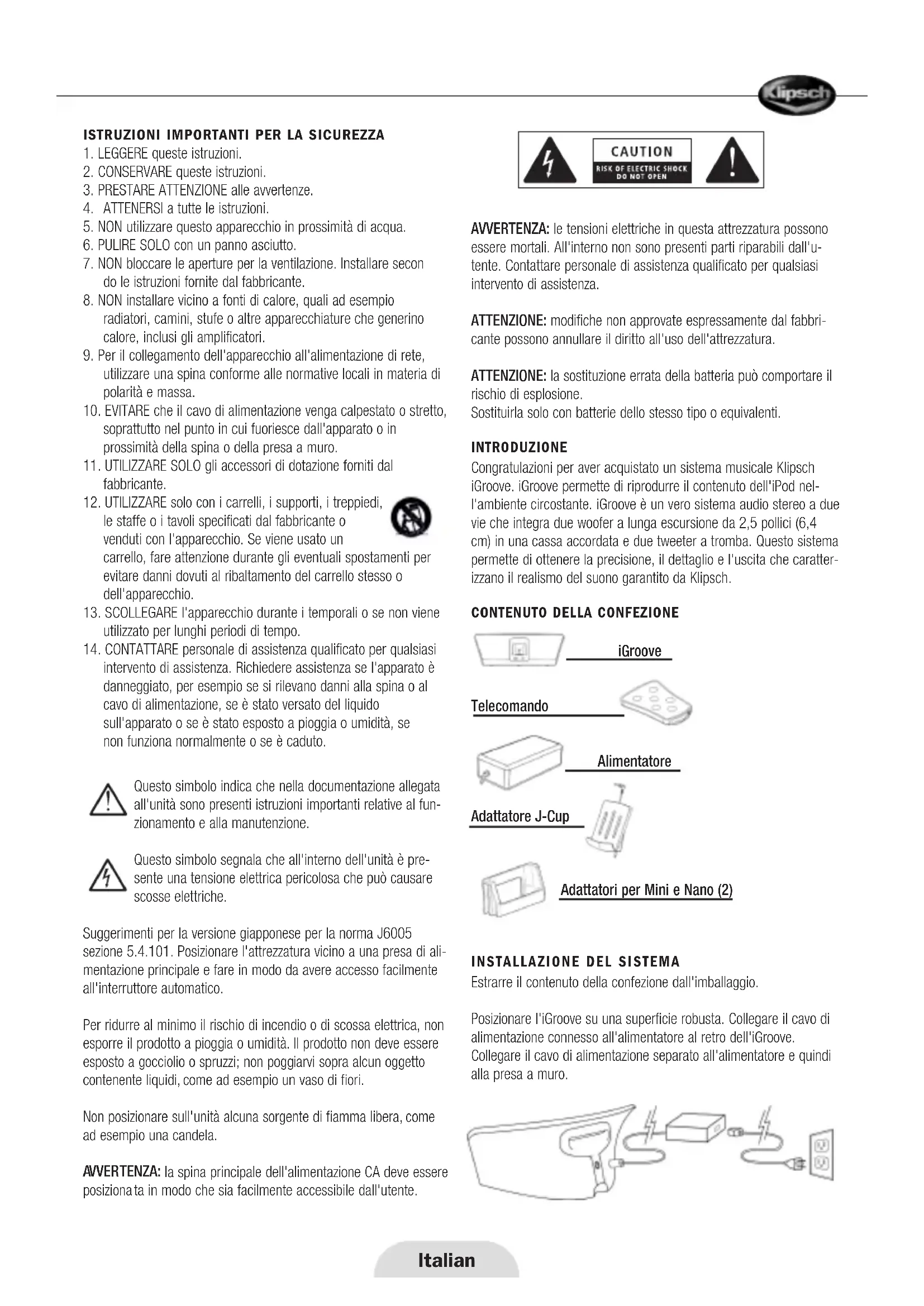 VVER TENZA: la spina principale dell'alimentazione CA deve essere posiziona ta in modo che sia facilmente accessibile dall'utente. AVVERTENZA: le tensioni elettriche in questa attrezzatura possono essere mortali. All'interno non sono presenti parti riparabili dall'u- tente. Contattare personale di assistenza qualificato per qualsiasi intervento di assistenza. ATTENZIONE: modifiche non approvate espressamente dal fabbri- cante possono annullare il diritto all'uso dell'attrezzatura. ATTENZIONE: la sostituzione errata della batteria può comportare il rischio di esplosione. Sostituirla solo con batterie dello stesso tipo o equivalenti. INTRODUZIONE Congratulazioni per aver acquistato un sistema musicale Klipsch iGroove. iGroove permette di riprodurre il contenuto dell'iPod nel- l'ambiente circostante. iGroove è un vero sistema audio stereo a due vie che integra due woofer a lunga escursione da 2,5 pollici (6,4 cm) in una cassa accordata e due tweeter a tromba. Questo sistema permette di ottenere la precisione, il dettaglio e l'uscita che caratter- izzano il realismo del suono garantito da Klipsch.
