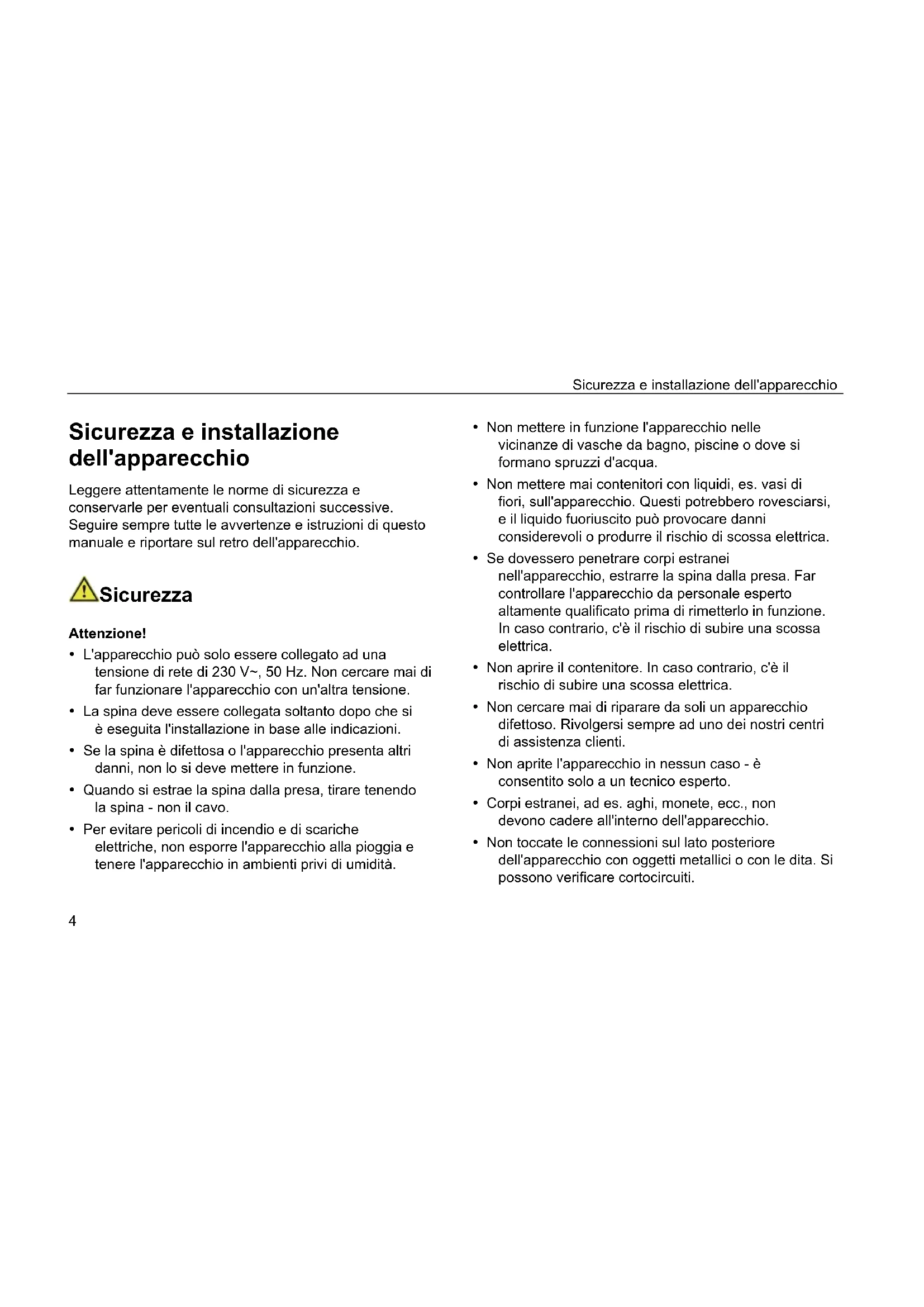 Sicurezza e installazione dell'apparecchio Leggere attentamente le norme di sicurezza e conservarle per eventuali consultazioni successive. Seguire sempre tutte le avvertenze e istruzioni di questo manuale e riportare sul retro dell'apparecchio. Sicurezza Attenzione!