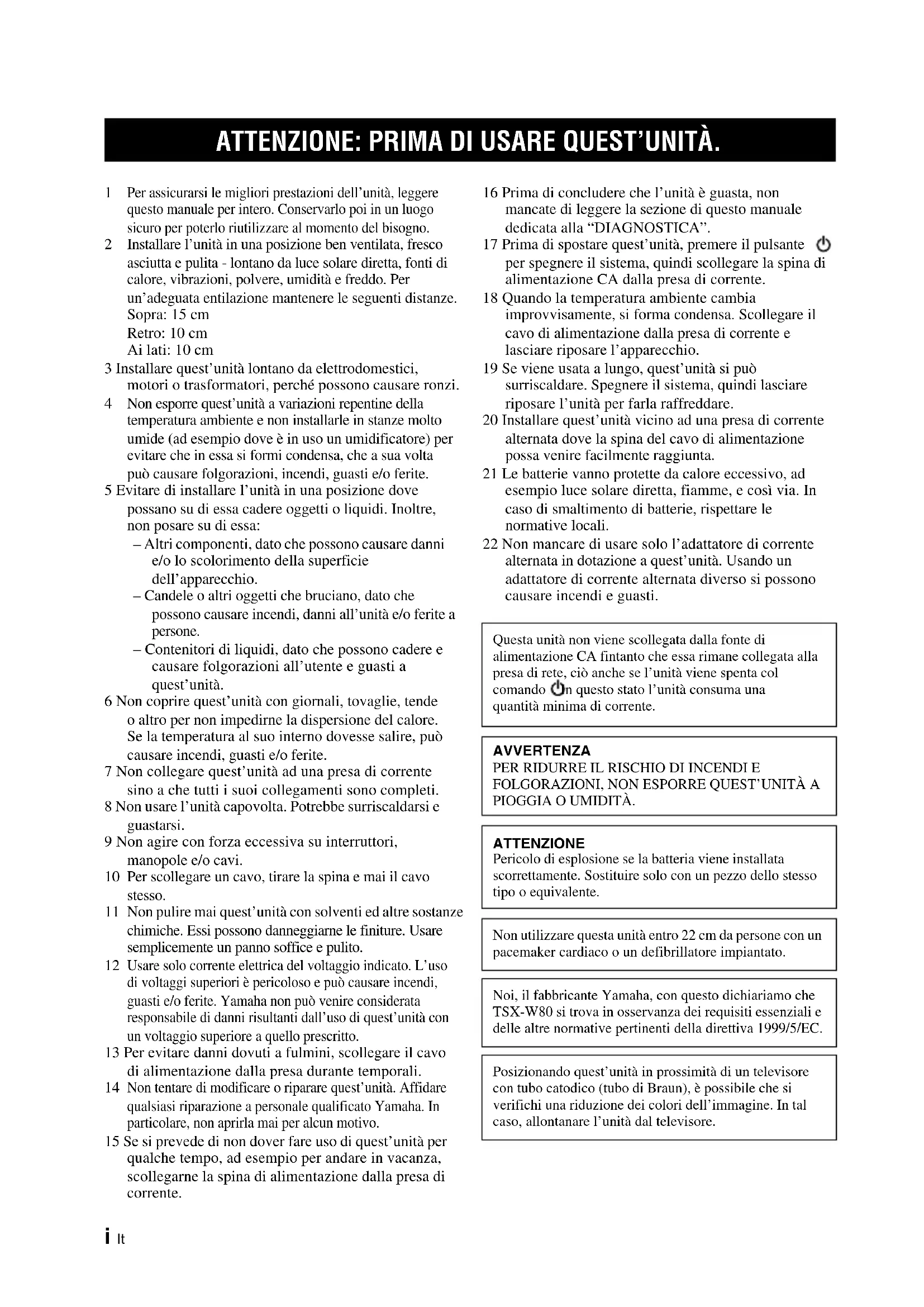 PIOGGIA O UMIDITÀ. ATTENZIONE Pericolo di esplosione se la batteria viene installata scorrettamente. Sostituire solo con un pezzo dello stesso tipo o equivalente. Non utilizzare questa unità entro 22 cm da persone con un pacemaker cardiaco o un defibrillatore impiantato. Noi, il fabbricante Yamaha, con questo dichiariamo che TSX-W80 si trova in osservanza dei requisiti essenziali e delle altre normative pertinenti della direttiva 1999/5/EC. Posizionando quest’unità in prossimità di un televisore con tubo catodico (tubo di Braun), è possibile che si verifichi una riduzione dei colori dell’immagine. In tal caso, allontanare l’unità dal televisore.1 It Italiano PREPARATION