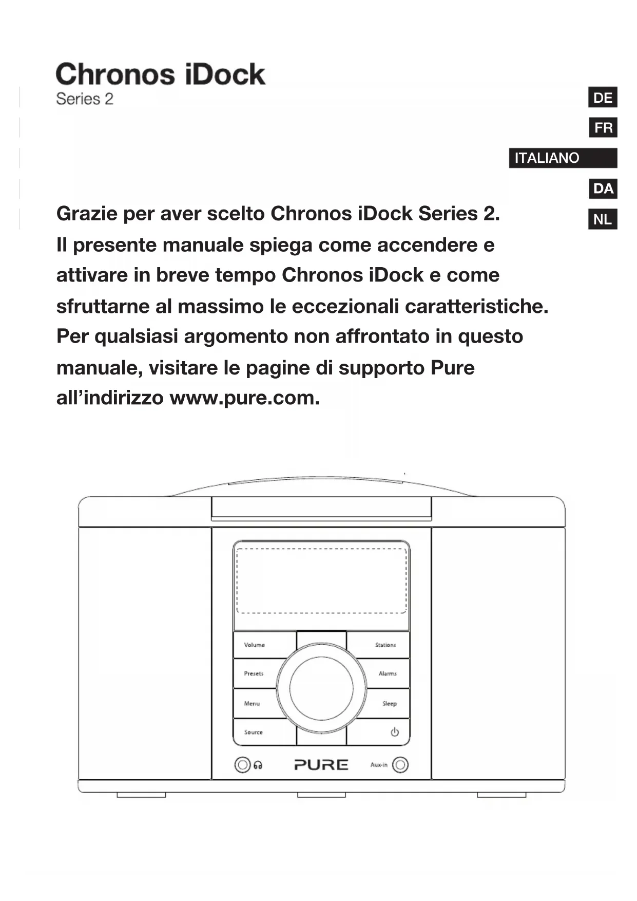 Grazie per aver scelto Chronos iDock Series 2. Il presente manuale spiega come accendere e attivare in breve tempo Chronos iDock e come sfruttarne al massimo le eccezionali caratteristiche. Per qualsiasi argomento non affrontato in questo manuale, visitare le pagine di supporto Pure all’indirizzo www.pure.com.Istruzioni di sicurezza Tenere la radio lontana da fonti di calore come fiamme vive o candele. Assicurarsi che l'unità riceva una ventilazione adeguata (almeno 10cm di spazio libero). Evitare il contatto con l'acqua. Evitare lo sgocciolamento di liquidi sulla radio. Non collocare oggetti contenenti liquidi (es. vasi) sull'unità. Una volta inserito nella presa, Chronos iDock resta connesso alla rete elettrica anche quando si trova in standby e con la luce del display spenta. Per disconnettere completamente l'unità, staccare la spina dalla rete elettrica. Assicurarsi che la spina di alimentazione principale sia facilmente accessibile in caso si renda necessaria la disconnessione dalla rete di alimentazione principale. L'esposizione prolungata a suoni ad alto volume connessa all'uso delle cuffie può provocare danni all'udito. Copyright Copyright 2012 by Imagination Technologies Limited. Tutti i diritti riservati. Nessuna parte della presente pubblicazione può essere copiata o distribuita, trasmessa, trascritta, memorizzata in un sistema di archiviazione, o tradotta in un formato normalmente comprensibile, in qualsiasi forma o con qualsiasi mezzo, elettronico, meccanico, magnetico, manuale o altro, o divulgata a terze parti senza il permesso scritto di Imagination Technologies Limited. Marchi Chronos iDock, il logo Chronos iDock, Pure, il logo Pure, Imagination Technologies e il logo Imagination Technologies sono marchi o marchi registrati di Imagination Technologies Limited. iPhone e iPod sono marchi commerciali di Apple Inc., registrati negli Stati Uniti e in altri Paesi. Tutti gli altri nomi di prodotti sono marchi di proprietà delle rispettive società. Versione 2 July 2012. Informazioni sulla garanzia Imagination Technologies Ltd. garantisce all’utente finale che il presente prodotto è esente da difetti di materiale e fabbricazione in condizioni normali di utilizzo per un periodo di due anni a partire dalla data di acquisto. La presente garanzia copre i danni dovuti a difetti di fabbricazione o progettazione; non si applica in casi quali danni accidentali, in qualsiasi modo siano stati provocati, usura, negligenza, regolazione, modifica o riparazione non autorizzate. Visitare il sito www.pure.com/register per registrare il prodotto. In caso di problemi relativi all’unità, contattare il proprio fornitore oppure contattare il Supporto tecnico Pure all’indirizzo indicato sul retro del presente manuale. Dichiarazione di non responsabilità Imagination Technologies Limited non si assume alcuna responsabilità rispetto al contenuto del presente documento, in particolare non riconosce nessuna garanzia implicita di commerciabilità o idoneità per uno scopo specifico. Inoltre, Imagination Technologies Limited si riserva il diritto di revisionare la presente pubblicazione e di apportarvi modifiche periodiche senza alcun obbligo di notifica a qualsiasi persona o organizzazione. Le diciture “Made for iPod” e “Made for iPhone” attestano che l'accessorio elettronico è stato specificamente concepito per essere collegato ad iPod e iPhone e che lo sviluppatore ne certifica la conformità agli standard prestazionali Apple. Apple non è responsabile del funzionamento di questo apparecchio e della sua conformità alle norme di sicurezza o ai requisiti di legge. L'uso di questo accessorio con iPod e iPhone può influire sulle prestazioni wireless. Smaltimento di rifiuti di apparecchiature elettriche ed elettroniche La presenza di questo simbolo sul prodotto o sulla sua confezione indica che il prodotto non deve essere trattato come rifiuto domestico. Al contrario, esso deve essere consegnato a un adeguato punto di raccolta per il riciclaggio di apparecchiature elettriche ed elettroniche. Assicurandosi del corretto smaltimento di questo prodotto si contribuisce a evitare potenziali ripercussioni negative sull'ambiente e sulla salute, che potrebbero derivare da un'inadeguata gestione dello smaltimento stesso. Il riciclaggio di materiali contribuisce a preservare le risorse naturali. Per informazioni più dettagliate sul riciclaggio di questo prodotto, si prega di rivolgersi alle autorità locali, al servizio locale di smaltimento di rifiuti domestici o al negozio presso il quale il prodotto è stato acquistato.1