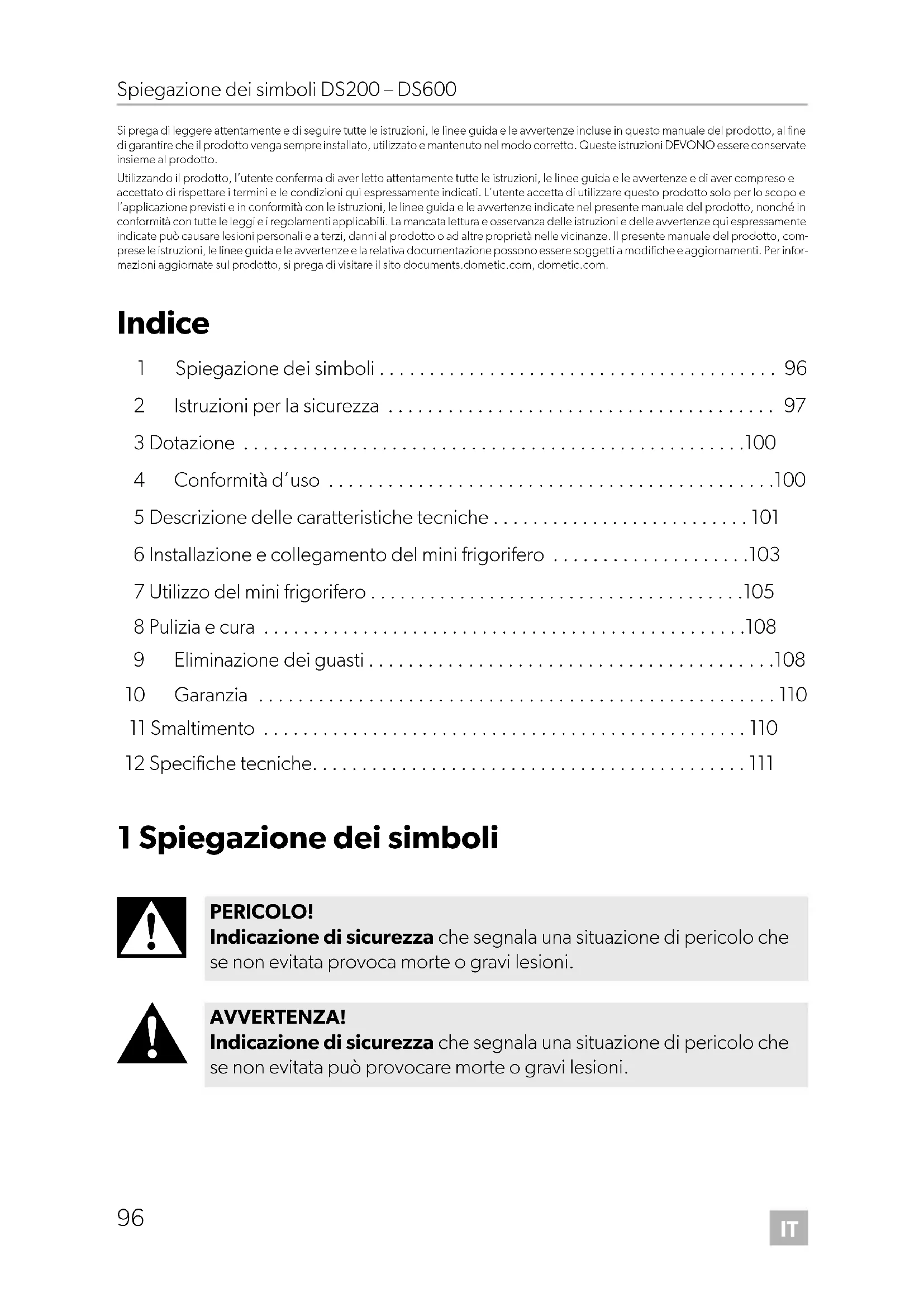 PERICOLO! Indicazione di sicurezza che segnala una situazione di pericolo che se non evitata provoca morte o gravi lesioni. AVVERTENZA! Indicazione di sicurezza che segnala una situazione di pericolo che se non evitata può provocare morte o gravi lesioni. DometicDS200-300-400-600_IOM_4445103315_EMEA16_2020-xx-xx.book Seite 96 Mittwoch, 3. März 2021 11:36 11IT DS200 – DS600 Istruzioni per la sicurezza