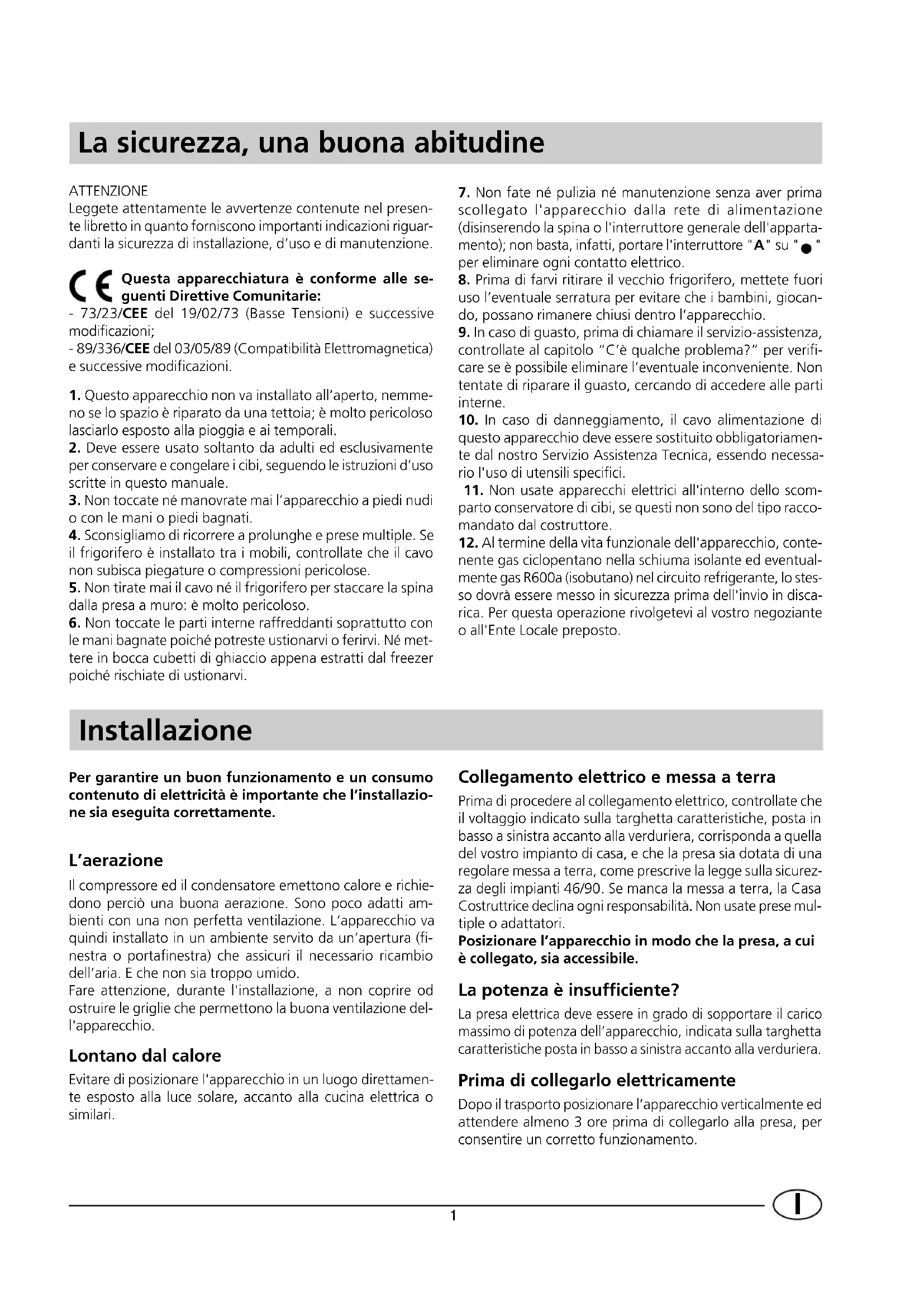 nente gas ciclopentano nella schiuma isolante ed eventual- mente gas R600a (isobutano) nel circuito refrigerante, lo stes- so dovrà essere messo in sicurezza prima dell'invio in disca- rica. Per questa operazione rivolgetevi al vostro negoziante o all'Ente Locale preposto. Installazione Per garantire un buon funzionamento e un consumo contenuto di elettricità è importante che l’installazio- ne sia eseguita correttamente. L’aerazione Il compressore ed il condensatore emettono calore e richie- dono perciò una buona aerazione. Sono poco adatti am- bienti con una non perfetta ventilazione. L’apparecchio va quindi installato in un ambiente servito da un’apertura (fi- nestra o portafinestra) che assicuri il necessario ricambio dell’aria. E che non sia troppo umido. Fare attenzione, durante l'installazione, a non coprire od ostruire le griglie che permettono la buona ventilazione del- l'apparecchio. Lontano dal calore Evitare di posizionare l'apparecchio in un luogo direttamen- te esposto alla luce solare, accanto alla cucina elettrica o similari. Collegamento elettrico e messa a terra Prima di procedere al collegamento elettrico, controllate che il voltaggio indicato sulla targhetta caratteristiche, posta in basso a sinistra accanto alla verduriera, corrisponda a quella del vostro impianto di casa, e che la presa sia dotata di una regolare messa a terra, come prescrive la legge sulla sicurez- za degli impianti 46/90. Se manca la messa a terra, la Casa Costruttrice declina ogni responsabilità. Non usate prese mul- tiple o adattatori. Posizionare l’apparecchio in modo che la presa, a cui è collegato, sia accessibile. La potenza è insufficiente? La presa elettrica deve essere in grado di sopportare il carico massimo di potenza dell’apparecchio, indicata sulla targhetta caratteristiche posta in basso a sinistra accanto alla verduriera. Prima di collegarlo elettricamente Dopo il trasporto posizionare l’apparecchio verticalmente ed attendere almeno 3 ore prima di collegarlo alla presa, per consentire un corretto funzionamento. ATTENZIONE Leggete attentamente le avvertenze contenute nel presen- te libretto in quanto forniscono importanti indicazioni riguar- danti la sicurezza di installazione, d’uso e di manutenzione. Questa apparecchiatura è conforme alle se- guenti Direttive Comunitarie: - 73/23/CEE del 19/02/73 (Basse Tensioni) e successive modificazioni; - 89/336/CEE del 03/05/89 (Compatibilità Elettromagnetica) e successive modificazioni.