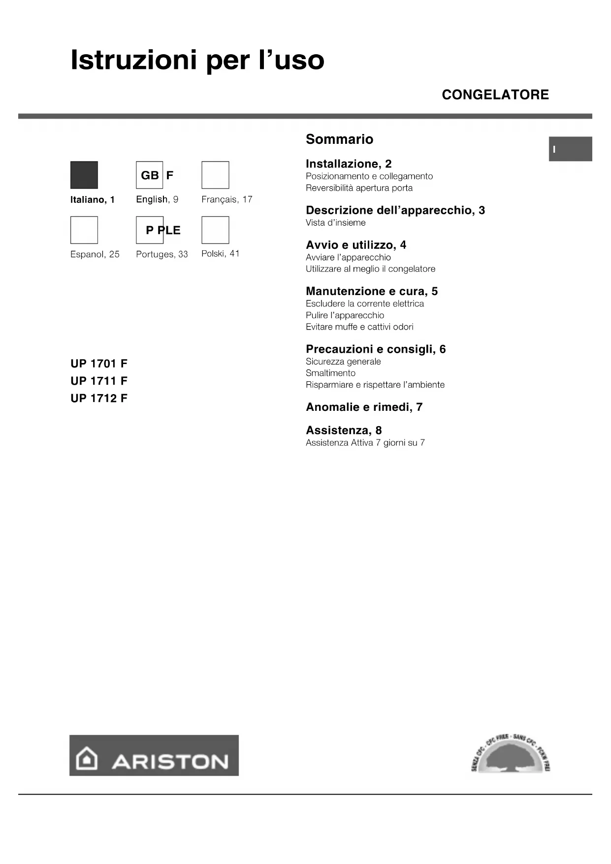 Istruzioni per luso CONGELATORE UP 1701 F UP 1711 F UP 1712 F Sommario Installazione, 2 Posizionamento e collegamento Reversibilità apertura porta Descrizione dellapparecchio, 3 Vista dinsieme Avvio e utilizzo, 4 Avviare lapparecchio Utilizzare al meglio il congelatore Manutenzione e cura, 5 Escludere la corrente elettrica Pulire lapparecchio Evitare muffe e cattivi odori Precauzioni e consigli, 6 Sicurezza generale Smaltimento Risparmiare e rispettare lambiente Anomalie e rimedi, 7 Assistenza, 8 Assistenza Attiva 7 giorni su 7 Italiano, 1 Français, 17 English, 9 GBI F Portuges , 33 Polski, 41 Espanol, 25 P PLE2