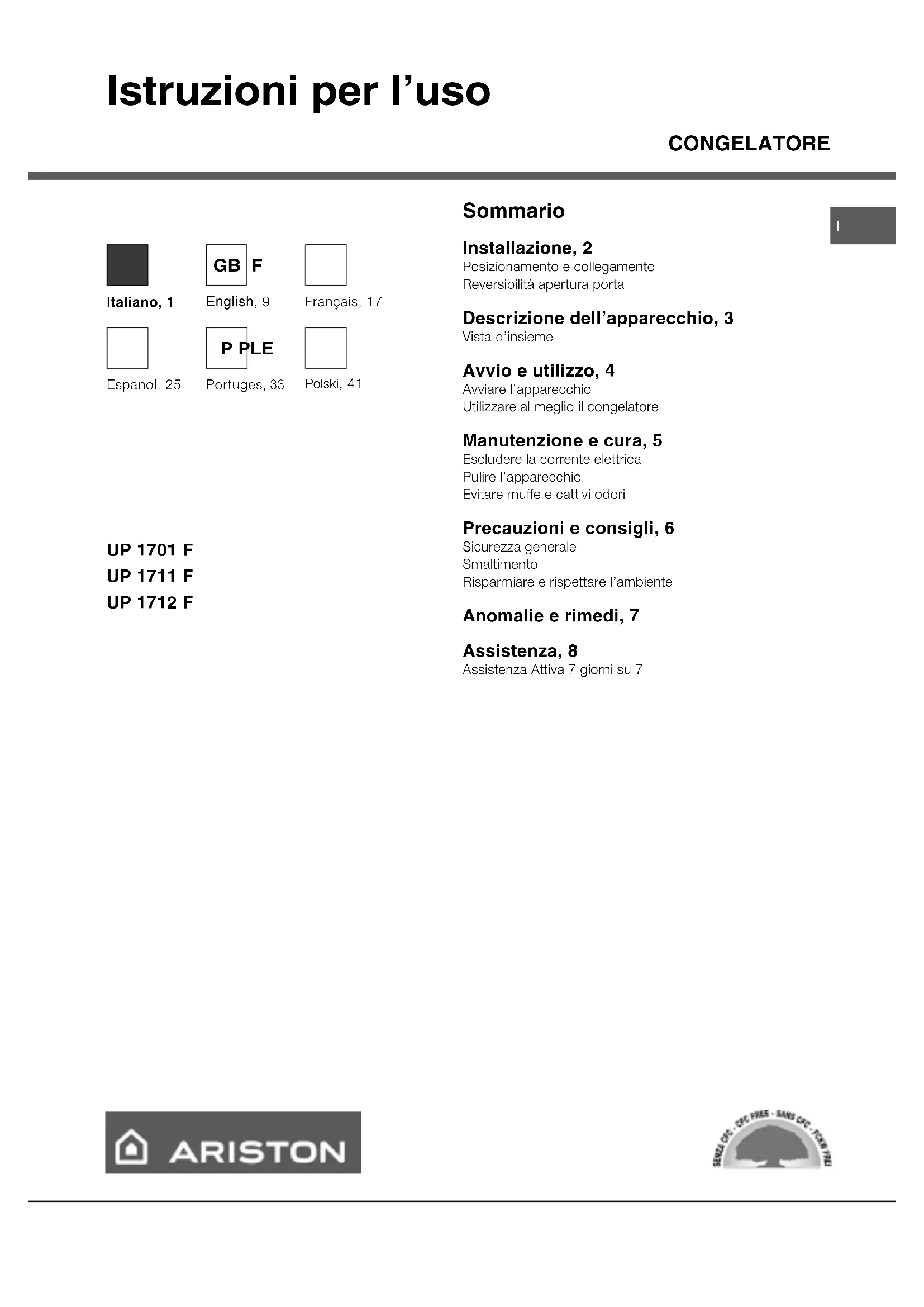 Istruzioni per luso CONGELATORE UP 1701 F UP 1711 F UP 1712 F Sommario Installazione, 2 Posizionamento e collegamento Reversibilità apertura porta Descrizione dellapparecchio, 3 Vista dinsieme Avvio e utilizzo, 4 Avviare lapparecchio Utilizzare al meglio il congelatore Manutenzione e cura, 5 Escludere la corrente elettrica Pulire lapparecchio Evitare muffe e cattivi odori Precauzioni e consigli, 6 Sicurezza generale Smaltimento Risparmiare e rispettare lambiente Anomalie e rimedi, 7 Assistenza, 8 Assistenza Attiva 7 giorni su 7 Italiano, 1 Français, 17 English, 9 GBI F Portuges , 33 Polski, 41 Espanol, 25 P PLE2