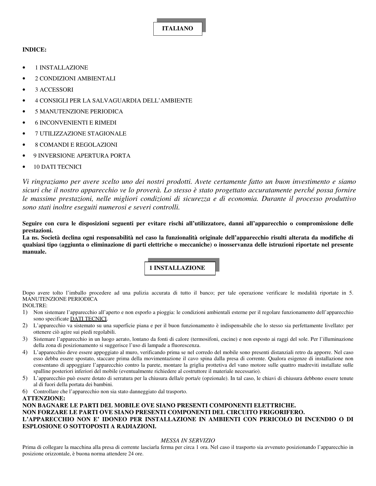 ATTENZIONE: NON BAGNARE LE PARTI DEL MOBILE OVE SIANO PRESENTI COMPONENTI ELETTRICHE. NON FORZARE LE PARTI OVE SIANO PRESENTI COMPONENTI DEL CIRCUITO FRIGORIFERO. L’APPARECCHIO NON E’ IDONEO PER INSTALLAZIONE IN AMBIENTI CON PERICOLO DI INCENDIO O DI ESPLOSIONE O SOTTOPOSTI A RADIAZIONI. MESSA IN SERVIZIO Prima di collegare la macchina alla presa di corrente lasciarla ferma per circa 1 ora. Nel caso il trasporto sia avvenuto posizionando l’apparecchio in posizione orizzontale, è buona norma attendere 24 ore.