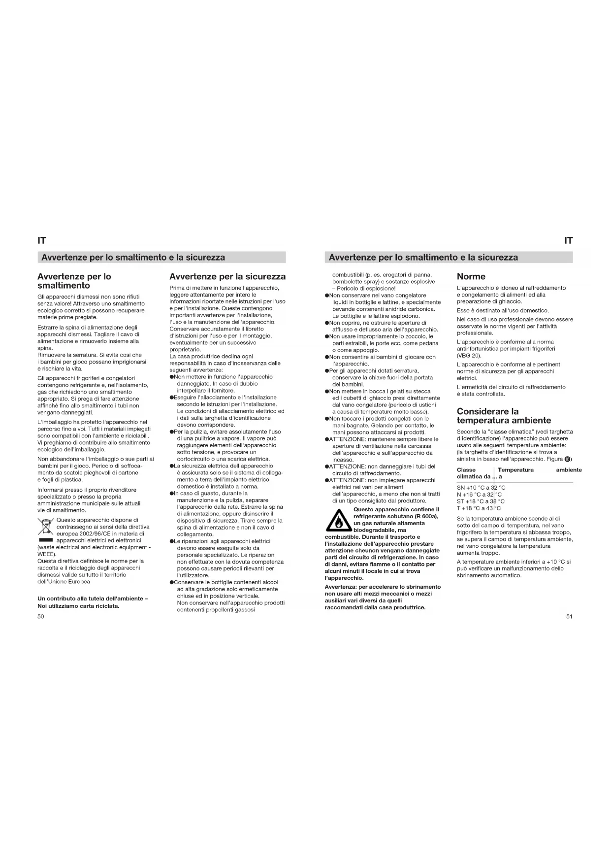 Classe Temperatura ambiente climatica da ... a SN +10 °C a 32 °C N +16 °C a 32 °C ST +18 °C a 38 °C T +18 °C a 43 °C Se la temperatura ambiene scende al di sotto del campo di temperatura, nel vano frigorifero la temperatura si abbassa troppo, se supera il campo di temperatura ambiente, nel vano congelatore la temperatura aumenta troppo. A temperature ambiente inferiori a +10 °C si può verificare un malfunzionamento dello sbrinamento automatico. Avvertenze per lo smaltimento e la sicurezza