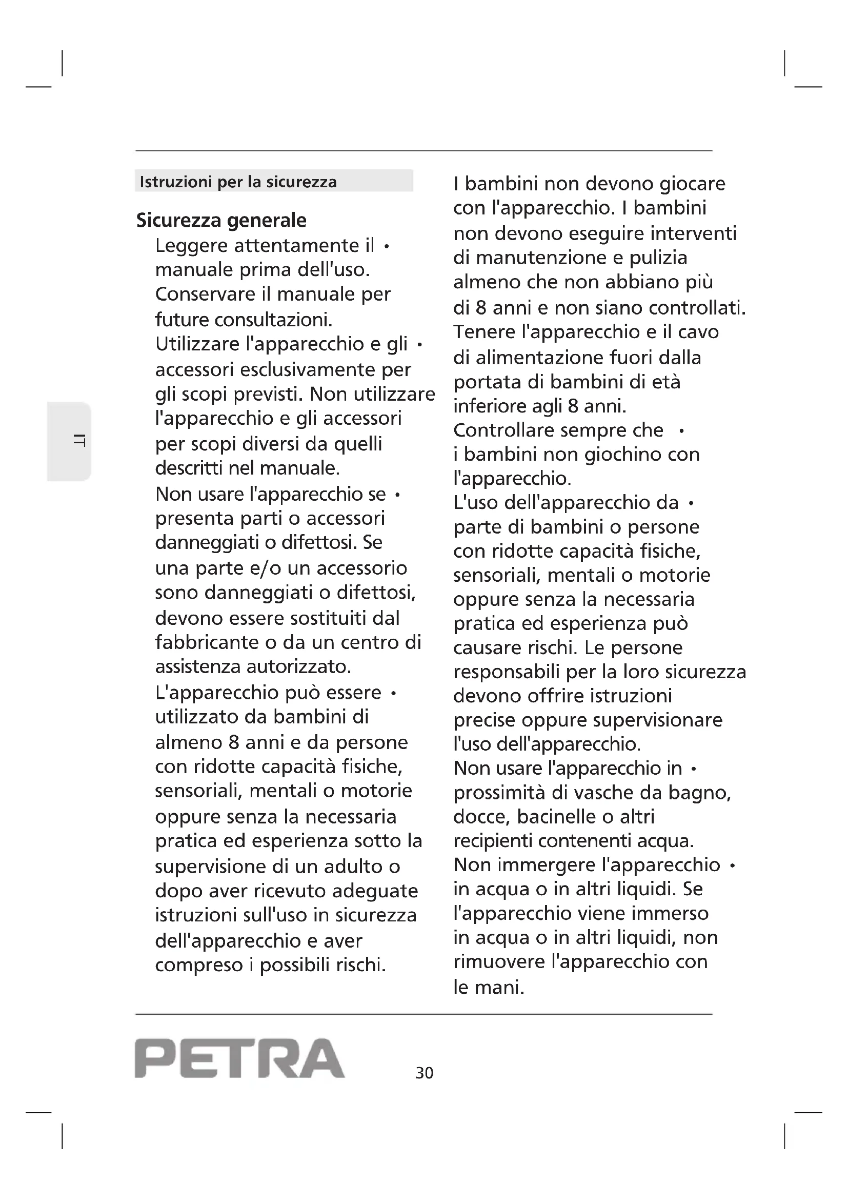 Istruzioni per la sicurezza Sicurezza generale Leggere attentamente il • manuale prima dell'uso. Conservare il manuale per future consultazioni. Utilizzare l'apparecchio e gli • accessori esclusivamente per gli scopi previsti. Non utilizzare l'apparecchio e gli accessori per scopi diversi da quelli descritti nel manuale. Non usare l'apparecchio se • presenta parti o accessori danneggiati o difettosi. Se una parte e/o un accessorio sono danneggiati o difettosi, devono essere sostituiti dal fabbricante o da un centro di assistenza autorizzato. L'apparecchio può essere • utilizzato da bambini di almeno 8 anni e da persone con ridotte capacità fisiche, sensoriali, mentali o motorie oppure senza la necessaria pratica ed esperienza sotto la supervisione di un adulto o dopo aver ricevuto adeguate istruzioni sull'uso in sicurezza dell'apparecchio e aver compreso i possibili rischi. I bambini non devono giocare con l'apparecchio. I bambini non devono eseguire interventi di manutenzione e pulizia almeno che non abbiano più di 8 anni e non siano controllati. Tenere l'apparecchio e il cavo di alimentazione fuori dalla portata di bambini di età inferiore agli 8 anni. Controllare sempre che • i bambini non giochino con l'apparecchio. L'uso dell'apparecchio da • parte di bambini o persone con ridotte capacità fisiche, sensoriali, mentali o motorie oppure senza la necessaria pratica ed esperienza può causare rischi. Le persone responsabili per la loro sicurezza devono offrire istruzioni precise oppure supervisionare l'uso dell'apparecchio. Non usare l'apparecchio in • prossimità di vasche da bagno, docce, bacinelle o altri recipienti contenenti acqua. Non immergere l'apparecchio • in acqua o in altri liquidi. Se l'apparecchio viene immerso in acqua o in altri liquidi, non rimuovere l'apparecchio con le mani.31