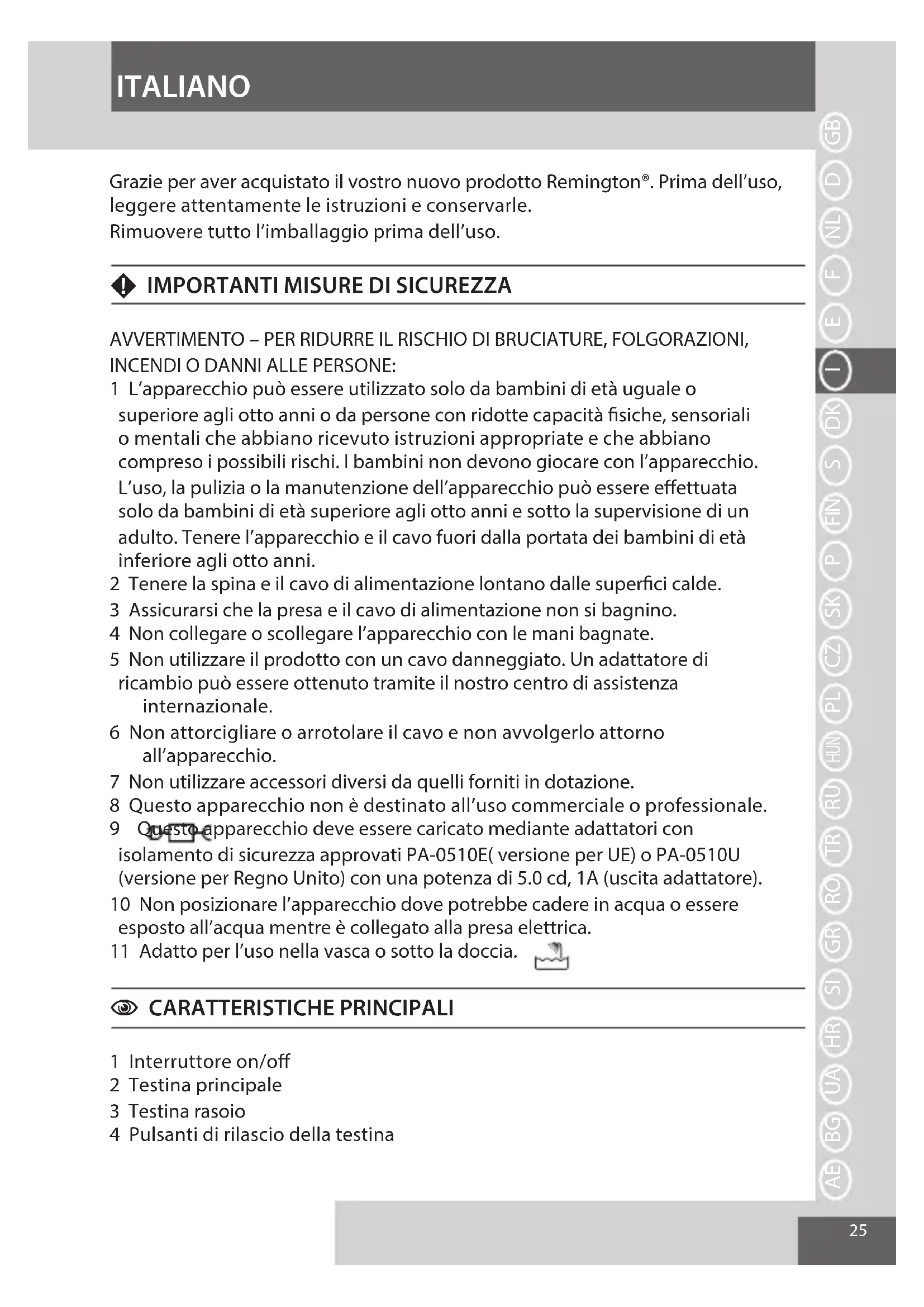 AVVERTIMENTO – PER RIDURRE IL RISCHIO DI BRUCIATURE, FOLGORAZIONI, INCENDI O DANNI ALLE PERSONE: 1 L’apparecchio può essere utilizzato solo da bambini di età uguale o superiore agli otto anni o da persone con ridotte capacità siche, sensoriali o mentali che abbiano ricevuto istruzioni appropriate e che abbiano compreso i possibili rischi. I bambini non devono giocare con l’apparecchio. L’uso, la pulizia o la manutenzione dell’apparecchio può essere eettuata solo da bambini di età superiore agli otto anni e sotto la supervisione di un adulto. Tenere l’apparecchio e il cavo fuori dalla portata dei bambini di età inferiore agli otto anni. 2 Tenere la spina e il cavo di alimentazione lontano dalle superci calde. 3 Assicurarsi che la presa e il cavo di alimentazione non si bagnino. 4 Non collegare o scollegare l’apparecchio con le mani bagnate. 5 Non utilizzare il prodotto con un cavo danneggiato. Un adattatore di ricambio può essere ottenuto tramite il nostro centro di assistenza internazionale. 6 Non attorcigliare o arrotolare il cavo e non avvolgerlo attorno all’apparecchio. 7 Non utilizzare accessori diversi da quelli forniti in dotazione. 8 Questo apparecchio non è destinato all’uso commerciale o professionale. 9 Questo apparecchio deve essere caricato mediante adattatori con isolamento di sicurezza approvati PA-0510E( versione per UE) o PA-0510U (versione per Regno Unito) con una potenza di 5.0 cd, 1A (uscita adattatore). 10 Non posizionare l’apparecchio dove potrebbe cadere in acqua o essere esposto all’acqua mentre è collegato alla presa elettrica. 11 Adatto per l’uso nella vasca o sotto la doccia.