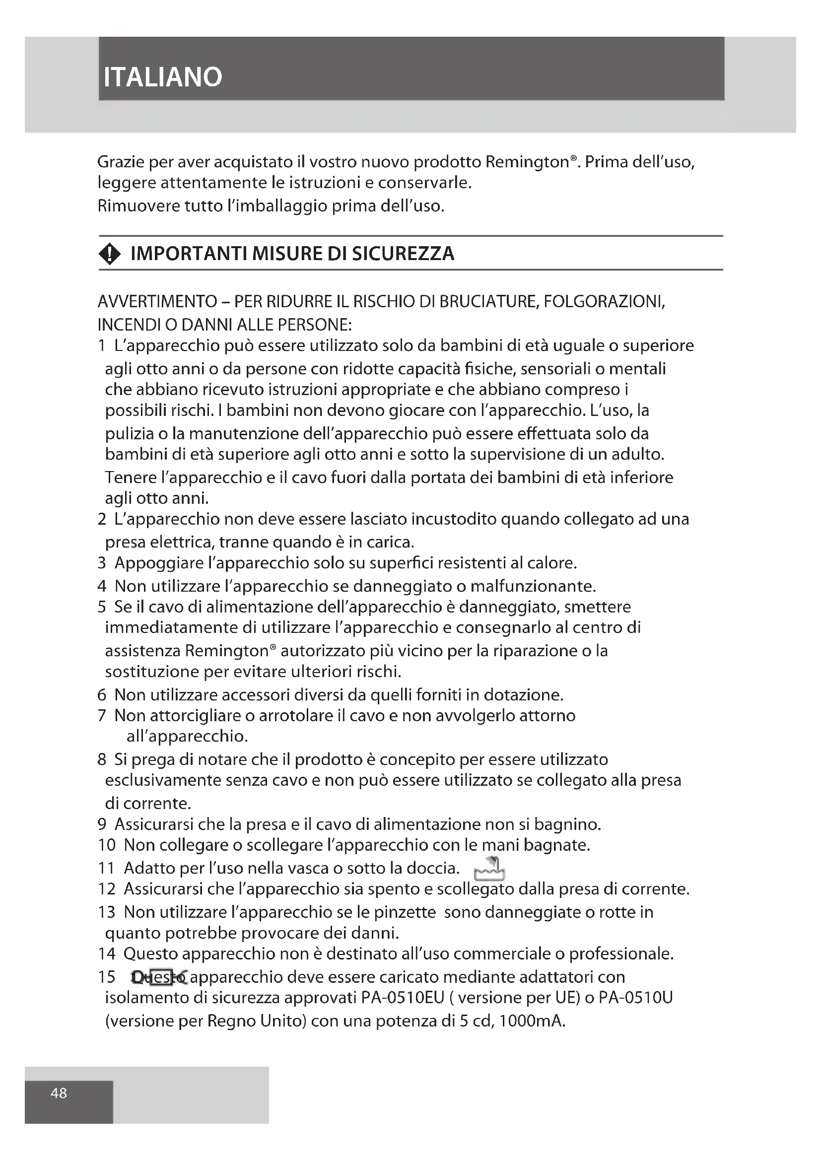 AVVERTIMENTO – PER RIDURRE IL RISCHIO DI BRUCIATURE, FOLGORAZIONI, INCENDI O DANNI ALLE PERSONE: 1 L’apparecchio può essere utilizzato solo da bambini di età uguale o superiore agli otto anni o da persone con ridotte capacità fisiche, sensoriali o mentali che abbiano ricevuto istruzioni appropriate e che abbiano compreso i possibili rischi. I bambini non devono giocare con l’apparecchio. L’uso, la pulizia o la manutenzione dell’apparecchio può essere effettuata solo da bambini di età superiore agli otto anni e sotto la supervisione di un adulto. Tenere l’apparecchio e il cavo fuori dalla portata dei bambini di età inferiore agli otto anni. 2 L’apparecchio non deve essere lasciato incustodito quando collegato ad una presa elettrica, tranne quando è in carica. 3 Appoggiare l’apparecchio solo su superfici resistenti al calore. 4 Non utilizzare l’apparecchio se danneggiato o malfunzionante. 5 Se il cavo di alimentazione dell’apparecchio è danneggiato, smettere immediatamente di utilizzare l’apparecchio e consegnarlo al centro di assistenza Remington® autorizzato più vicino per la riparazione o la sostituzione per evitare ulteriori rischi. 6 Non utilizzare accessori diversi da quelli forniti in dotazione. 7 Non attorcigliare o arrotolare il cavo e non avvolgerlo attorno all’apparecchio. 8 Si prega di notare che il prodotto è concepito per essere utilizzato esclusivamente senza cavo e non può essere utilizzato se collegato alla presa di corrente. 9 Assicurarsi che la presa e il cavo di alimentazione non si bagnino. 10 Non collegare o scollegare l’apparecchio con le mani bagnate. 11 Adatto per l’uso nella vasca o sotto la doccia. 12 Assicurarsi che l’apparecchio sia spento e scollegato dalla presa di corrente. 13 Non utilizzare l’apparecchio se le pinzette sono danneggiate o rotte in quanto potrebbe provocare dei danni. 14 Questo apparecchio non è destinato all’uso commerciale o professionale. 15 Questo apparecchio deve essere caricato mediante adattatori con isolamento di sicurezza approvati PA-0510EU ( versione per UE) o PA-0510U (versione per Regno Unito) con una potenza di 5 cd, 1000mA. ITALIANO49