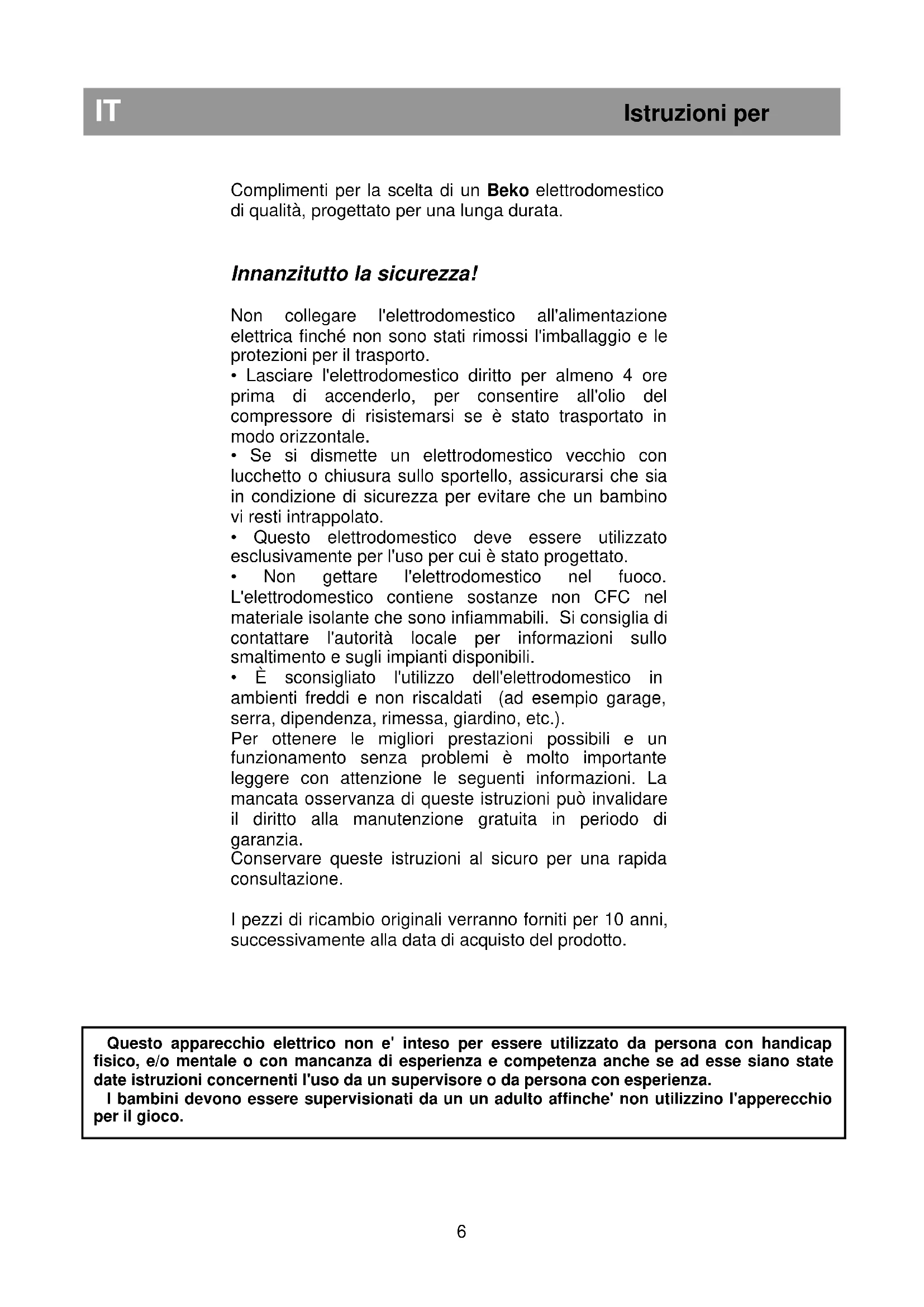 Questo apparecchio elettrico non e' inteso per essere utilizzato da persona con handicap fisico, e/o mentale o con mancanza di esperienza e competenza anche se ad esse siano state date istruzioni concernenti l'uso da un supervisore o da persona con esperienza. I bambini devono essere supervisionati da un un adulto affinche' non utilizzino l'apperecchio per il gioco.IT Istruzioni per l'uso Requisiti elettrici Prima di inserire la spina nella presa a muro assicurarsi che la tensione e la frequenza riportate sull'etichetta informativa all'interno dell'elettrodomestico corrispondano all'alimentazione in uso. Si consiglia di collegare questo elettrodomestico alla rete di alimentazione tramite una presa dotata di inte rruttore e fusibile in una posizione facilmente accessibile. Avvertenza! Questo elettrodomestico deve essere dotato di messa a terra. Le riparazioni all'apparecchiatura elettrica devono essere eseguite elusivamente da tecnici qualificati. Riparazioni errate eseguite da persone non qualificate possono provocare conseguenze cruciali per l'utilizzatore dell'elettrodomestico. ATTENZIONE! Questo elettrodomestico utilizza il gas R 600a che rispetta l'ambiente ma è infiammabile. Durante il trasporto e l'installazione del prodotto è necessario fare attenzione a non danneggiare il sistema di raffreddamento. Se il sistema di raffreddamento è danneggiato e vi è perdita di gas dal sistema, tenere il prodotto lontano da fiamme e ventilare la stanza per il tempo necessario. AVVERTENZA - Non utilizzare apparecchiature meccaniche o altri mezzi diversi da quelli consigliati dal produttore per accelerare il processo di sbrinamento. AVVERTENZA - Non danneggiare il circuito del regriferante. AVVERTENZA - Non utilizzare componenti elettrici all'interno degli scomparti per la conservazione del cibo, a meno che non siano del tipo consigliato dal produttore. AVVERTENZA - Se il cavo di alimentazione è danneggiato, deve essere sostituito dal produttore, dal suo agente per l'assistenza o da persone similmente qualificate per evitare rischi. Istruzioni per il trasporto
