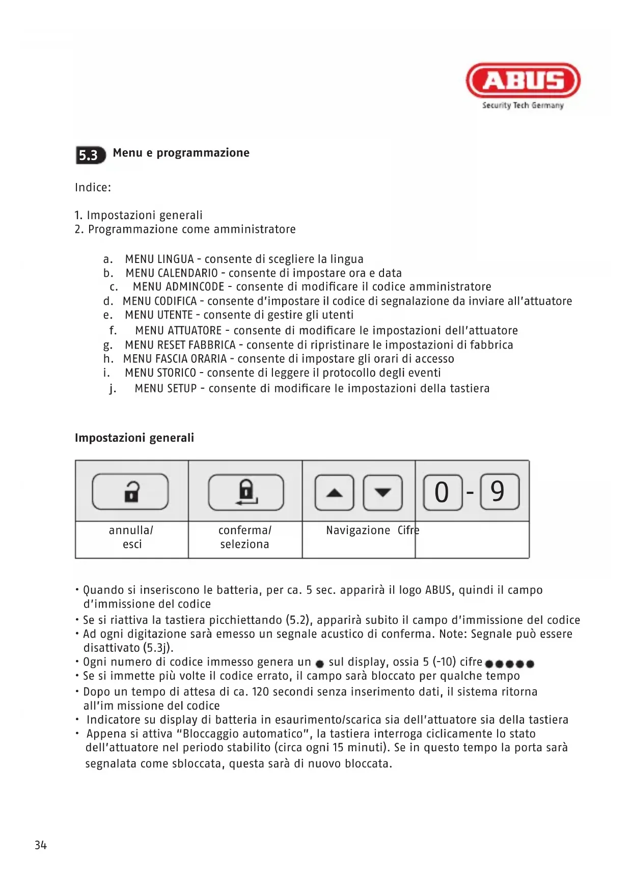 - Quando si inseriscono le batteria, per ca. 5 sec. apparirà il logo ABUS, quindi il campo d'immissione del codice