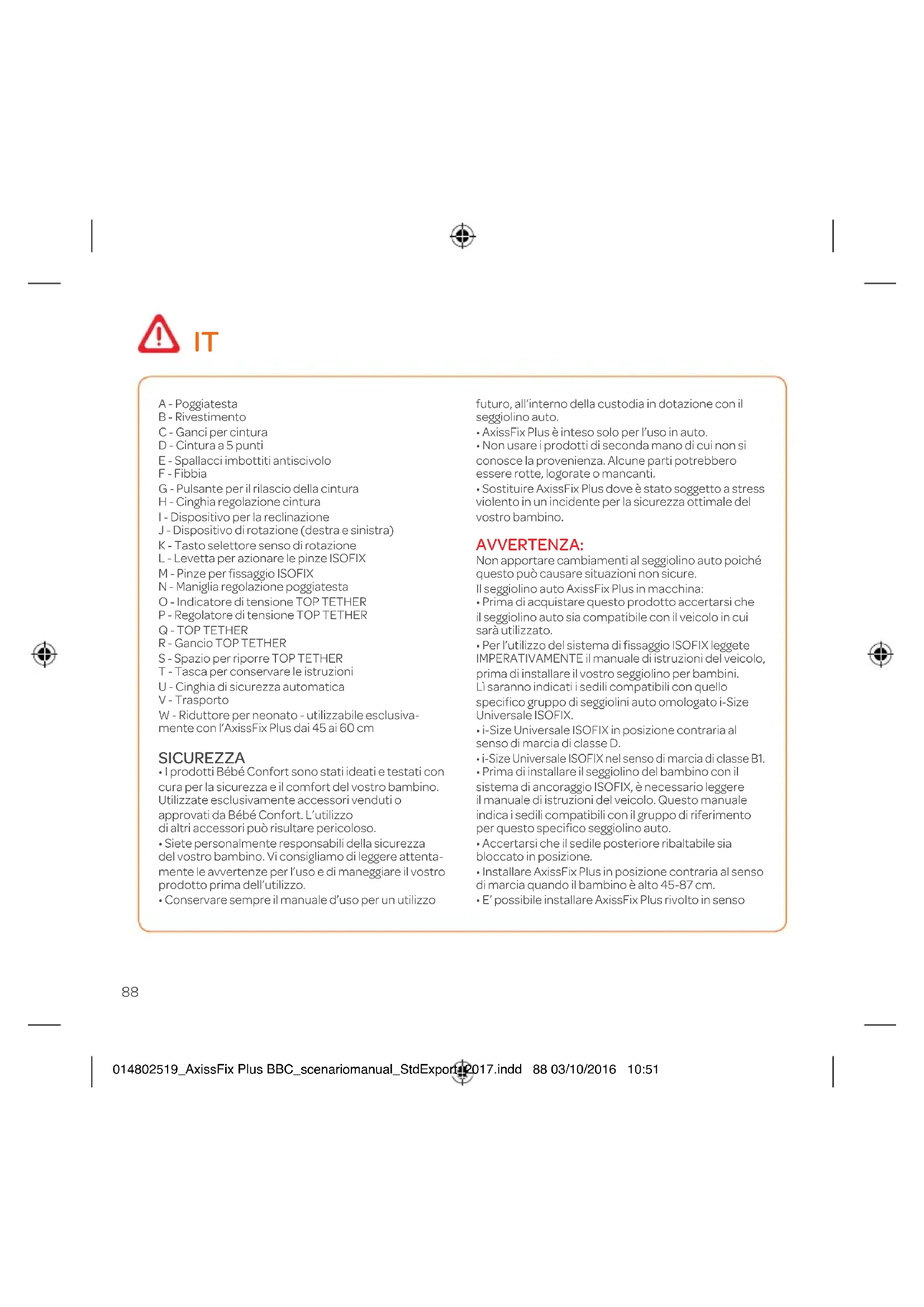 014802519_AxissFix Plus BBC_scenariomanual_StdExport_2017.indd 87 03/10/2016 10:5188 A - Poggiatesta B - Rivestimento C - Ganci per cintura D - Cintura a 5 punti E - Spallacci imbottiti antiscivolo F - Fibbia G - Pulsante per il rilascio della cintura H - Cinghia regolazione cintura I - Dispositivo per la reclinazione J - Dispositivo di rotazione (destra e sinistra) K - Tasto selettore senso di rotazione L - Levetta per azionare le pinze ISOFIX M - Pinze per fissaggio ISOFIX N - Maniglia regolazione poggiatesta O - Indicatore di tensione TOP TETHER P - Regolatore di tensione TOP TETHER