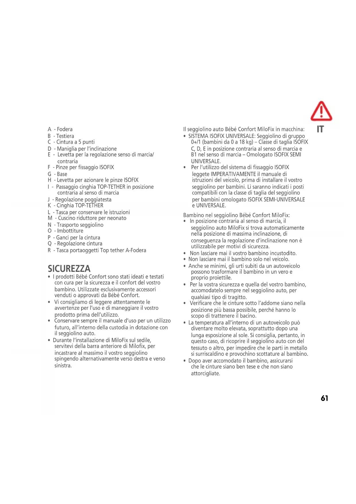- Pulire la scocca con un panno umido. Ambiente Tenete l’involucro di materia plastica lontano dalla portata dei bambini per evitare il soffocamento Quando smetterete di utilizzare il prodotto, vi preghiamo per la tutela dell’ambiente di smaltire il prodotto in modo differenziato e nel rispetto della normativa locale in materia. Domande Siete pregati di contattare il punto vendita autorizzato o di visitare il nostro sito web www.bebeconfort.com. Assicuratevi di avere a portata di mano le seguenti informazioni: - Numero di serie; - Età (altezza) e peso del vostro bambino. Garanzia La garanzia della durata di 24 mesi che applichiamo ai nostri prodotti riflette la fiducia che riponiamo nella qualità eccezionale del nostro design, della nostra progettazione e produzione, nonché delle prestazioni. Garantiamo che questo prodotto è stato fabbricato in conformità con gli attuali requisiti europei in materia di sicurezza e con gli standard di qualità applicabili a questo prodotto, e altresì che quest’ultimo è scevro da difetti legati alla manodopera o ai materiali impiegati al momento dell’acquisto. Alle condizioni qui menzionate, il cliente può ricorrere alla presente garanzia nei Paesi in cui il presente prodotto sia stato venduto da una controllata del gruppo Dorel o da un rivenditore o concessionario autorizzato. La nostra garanzia della durata di 24 mesi copre eventuali difetti dei materiali e di fabbricazione se il prodotto viene utilizzato in condizioni regolari ed in conformità con il nostro manuale d’istruzioni, per un periodo di 24 mesi dalla data dell’acquisto al dettaglio originale dal primo cliente utente finale. Per richiedere riparazioni o parti di ricambio in garanzia per i suddetti difetti, è necessario presentare la prova d’acquisto (che deve essere stato effettuato entro e non oltre i 24 mesi precedenti alla richiesta di assistenza). IT64 La garanzia non copre invece difetti causati da normale usura, danni causati da incidenti, utilizzo non corretto, negligenza, incendi, contatto con liquidi o altra causa esterna, danni derivanti dal mancato rispetto del manuale d’istruzioni, danni causati dall’utilizzo con un altro prodotto, danni causati da manutenzione da parte di persone da noi non autorizzate; la garanzia non vale altresì in caso di furto del prodotto o rimozione dal prodotto stesso o modifica di qualsiasi targhetta o numero identificativo. Esempi di normale usura includono parti quali: ruote e tessuti usurati da un utilizzo regolare del prodotto, nonché il naturale deterioramento dei colori e dei materiali in seguito al normale invecchiamento del prodotto. Cosa fare in caso di difetti: Qualora si verifichino problemi o difetti, la scelta migliore per un servizio rapido è rivolgersi al rivenditore autorizzato o dettagliante riconosciuto. La nostra garanzia di 24 mesi è riconosciuta dai rivenditori (1) . È necessario presentare la prova d’acquisto (che deve essere stato effettuato entro e non oltre i 24 mesi precedenti alla richiesta di assistenza). L’operazione è resa più semplice richiedendo prima l’approvazione da parte nostra. Se si presenta una richiesta valida ai sensi della presente garanzia, potremo richiedere al cliente di restituire il prodotto al rivenditore autorizzato o dettagliante riconosciuto o di spedire il prodotto presso di noi secondo le nostre istruzioni. Le relative spese di spedizione e reso sono a nostro carico, se vengono seguite tutte le istruzioni. I danni e/o difetti non coperti dalla nostra garanzia nè dai diritti legali dei consumatori e/o i danni e/o difetti in relazione a prodotti non coperti dalla nostra garanzia possono tuttavia essere gestiti secondo prezzi ragionevoli. Diritti del consumatore: Il consumatore gode di diritti legali secondo la legislazione applicabile al consumatore stesso, che può variare secondo il Paese. I diritti del consumatore ai sensi della legislazione nazionale vigente non sono inficiati dalla presente garanzia. Lifetime Warranty: Secondo i termini e le condizioni pubblicati sul nostro sito www.bebeconfort.com/lifetimewarranty, offriamo una Lifetime Warranty (garanzia a vita) volontaria del produttore ai primi utilizzatori. Per richiedere la Lifetime Warranty è necessario registrarsi sul nostro sito. La presente garanzia è offerta da Dorel Netherlands. Siamo iscritti al registro delle imprese nei Paesi Bassi con numero di registrazione 17060920. La nostra sede legale è Korendijk 5, 5704 RD Helmond, Paesi Bassi, e il nostro recapito postale è P.O. Box 6071, 5700 ET Helmond, Paesi Bassi. Dettagli di nomi e indirizzi di altre sussidiarie del gruppo Dorel si trovano sull’ultima pagina del presente manuale e sul nostro sito web per il marchio in questione. (1) I prodotti acquistati presso rivenditori che rimuovono o modificano le etichette o i numeri di identificazione sono considerati non autorizzati. Prodotti acquistati presso rivenditori non autorizzati sono considerati essi stessi non autorizzati. Nessuna garanzia si applica a questi prodotti, in quanto l’autenticità di questi prodotti non può essere accertata. IT65 A - Capa B - Protecção da cabeça C - Cinto de 5 pontos D - Alavanca de inclinação E - Alavanca de passagem de posição voltada para trás/voltada para a frente F - Garras para fixação ISOFIX G - Base H - Alavanca de accionamento das garras ISOFIX I - Passagem do cinto TOP-TETHER na posição voltada para trás J - Regulação do apoio da cabeça K - Cinto TOP-TETHER L - Compartimento de arrumação do manual M - Almofada para recém-nascidos N - Pega da cadeira de automóvel O - Protecções dos ombros P - Engates do cinto Q - Regulador do cinto R - Bolso de arrumação Top Tether SEGUÇA