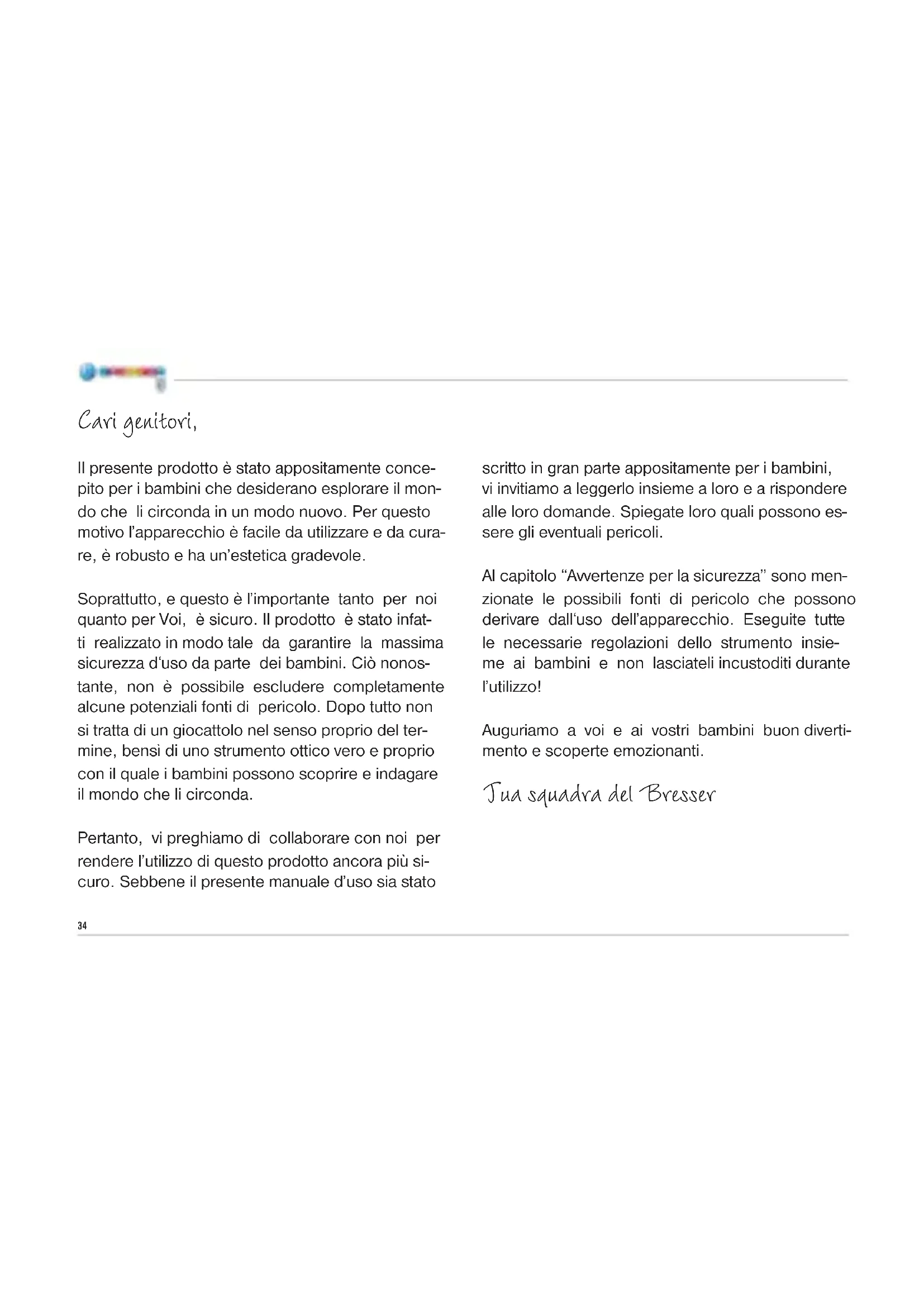 In sommige esjes zitten vloeistoffen die gem- akkelijk indrogen.NL34 Cari genitori, Il presente prodotto è stato appositamente conce- pito per i bambini che desiderano esplorare il mon- do che li circonda in un modo nuovo. Per questo motivo l’apparecchio è facile da utilizzare e da cura- re, è robusto e ha un’estetica gradevole. Soprattutto, e questo è l’importante tanto per noi quanto per Voi, è sicuro. Il prodotto è stato infat- ti realizzato in modo tale da garantire la massima sicurezza d‘uso da parte dei bambini. Ciò nonos- tante, non è possibile escludere completamente alcune potenziali fonti di pericolo. Dopo tutto non si tratta di un giocattolo nel senso proprio del ter- mine, bensì di uno strumento ottico vero e proprio con il quale i bambini possono scoprire e indagare il mondo che li circonda. Pertanto, vi preghiamo di collaborare con noi per rendere l’utilizzo di questo prodotto ancora più si- curo. Sebbene il presente manuale d’uso sia stato scritto in gran parte appositamente per i bambini, vi invitiamo a leggerlo insieme a loro e a rispondere alle loro domande. Spiegate loro quali possono es- sere gli eventuali pericoli. Al capitolo “Avvertenze per la sicurezza” sono men- zionate le possibili fonti di pericolo che possono derivare dall‘uso dell’apparecchio. Eseguite tutte le necessarie regolazioni dello strumento insie- me ai bambini e non lasciateli incustoditi durante l’utilizzo! Auguriamo a voi e ai vostri bambini buon diverti- mento e scoperte emozionanti. Tua squadra del Bresser35