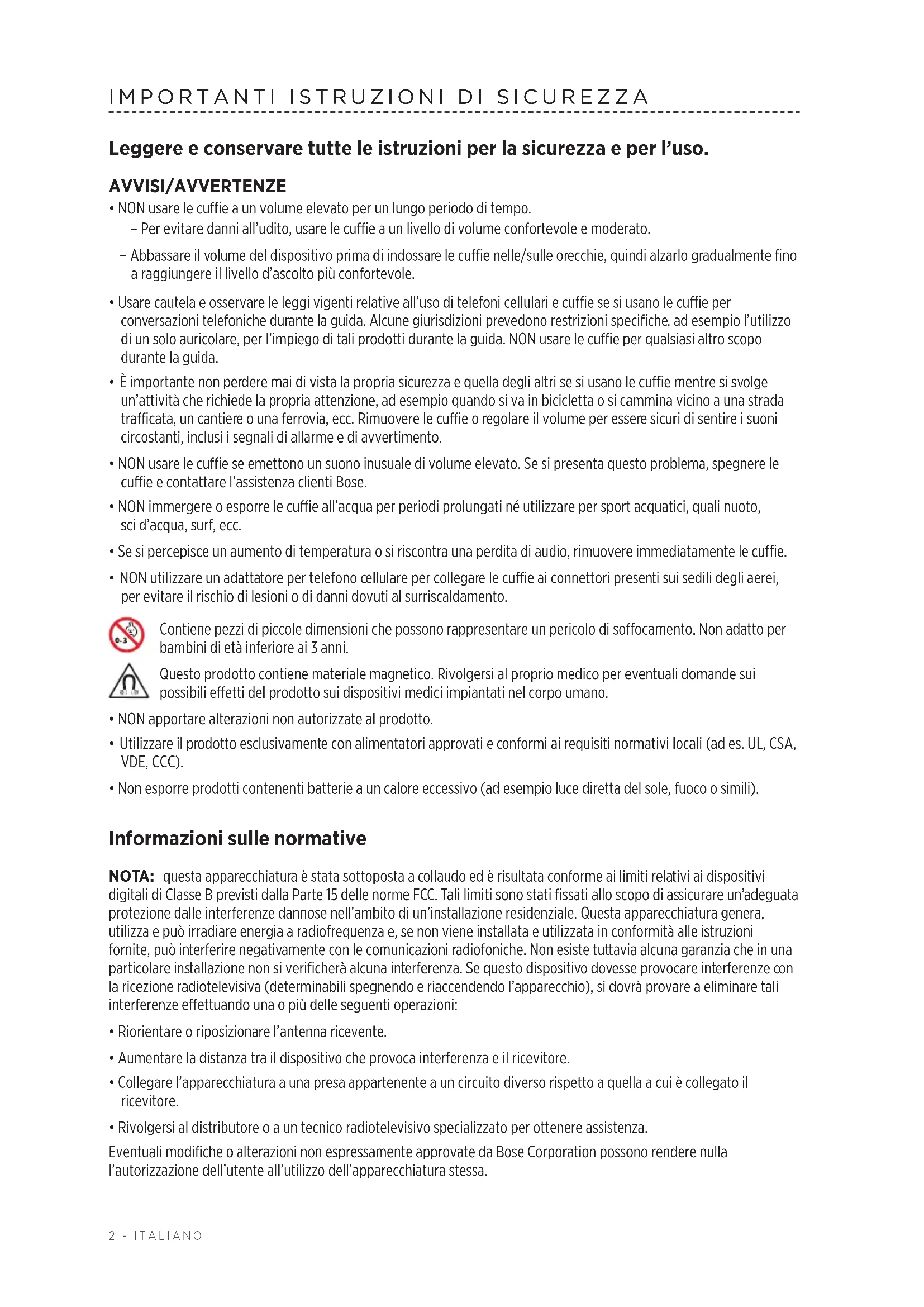 - NON usare le cuffie se emettono un suono inusuale di volume elevato. Se si presenta questo problema, spegnere le cuffie e contattare l’assistenza clienti Bose.