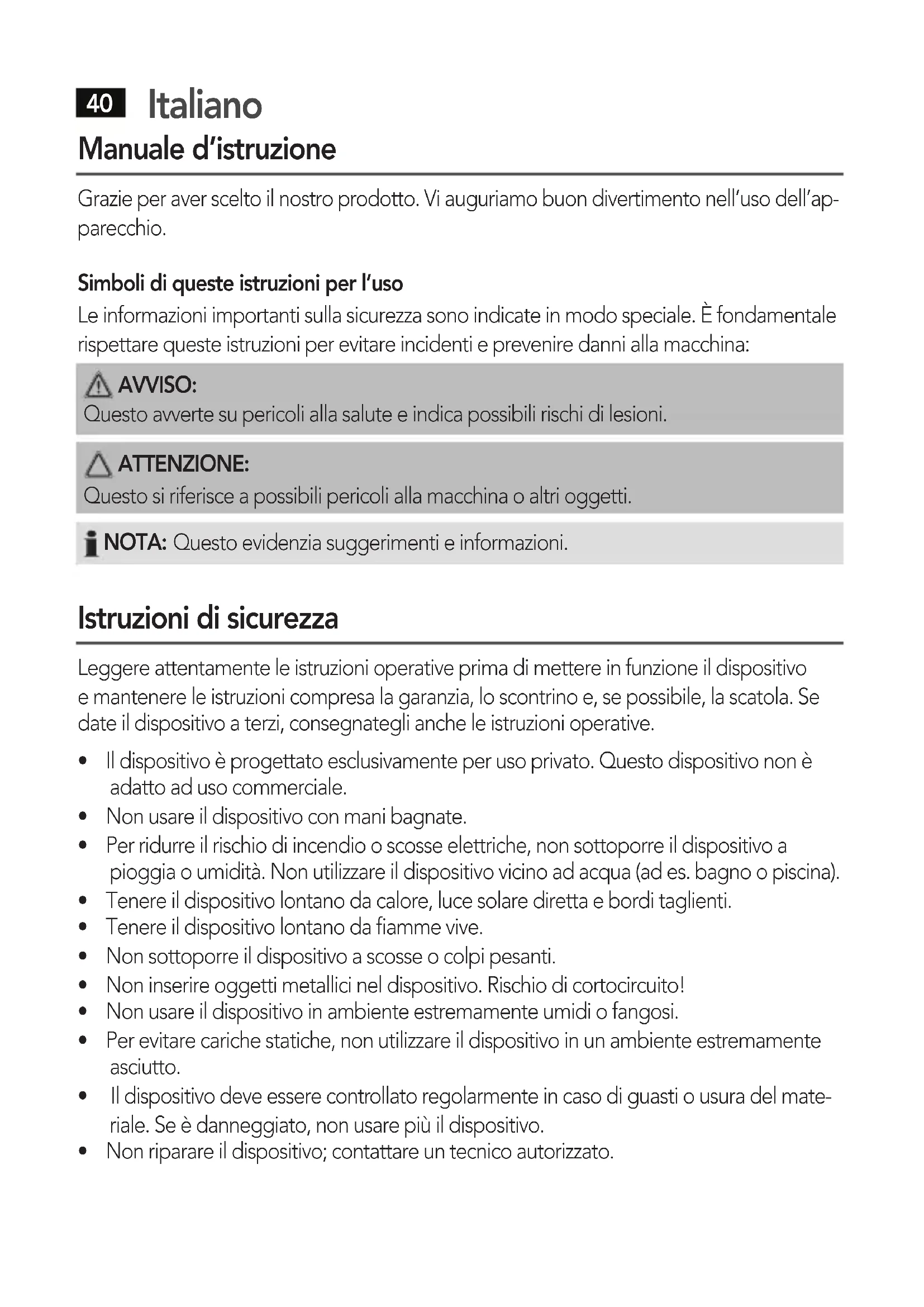Manuale d’istruzione Grazie per aver scelto il nostro prodotto. Vi auguriamo buon divertimento nell’uso dell’ap- parecchio. Simboli di queste istruzioni per l’uso Le informazioni importanti sulla sicurezza sono indicate in modo speciale. È fondamentale rispettare queste istruzioni per evitare incidenti e prevenire danni alla macchina: AVVISO: Questo avverte su pericoli alla salute e indica possibili rischi di lesioni. ATTENZIONE: Questo si riferisce a possibili pericoli alla macchina o altri oggetti. NOTA: Questo evidenzia suggerimenti e informazioni. Istruzioni di sicurezza Leggere attentamente le istruzioni operative prima di mettere in funzione il dispositivo e mantenere le istruzioni compresa la garanzia, lo scontrino e, se possibile, la scatola. Se date il dispositivo a terzi, consegnategli anche le istruzioni operative.