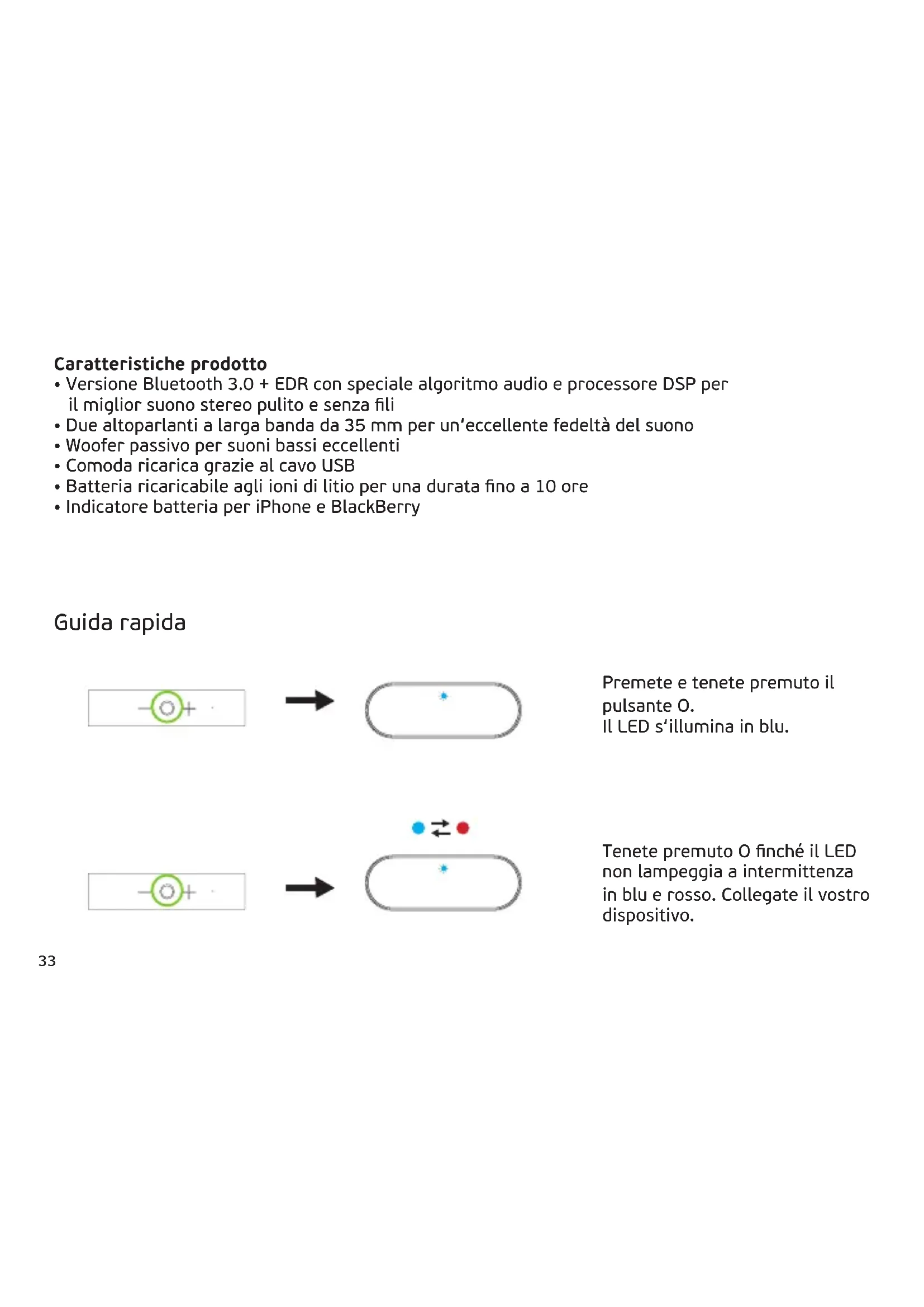 - Tenete premuto il tasto O no a quando il LED sul lato anteriore lampeggia in rosso/blu. L‘xq S10 ha 3 minuti di tempo di ricerca per stabilire il collegamento con un dispositivo BT.