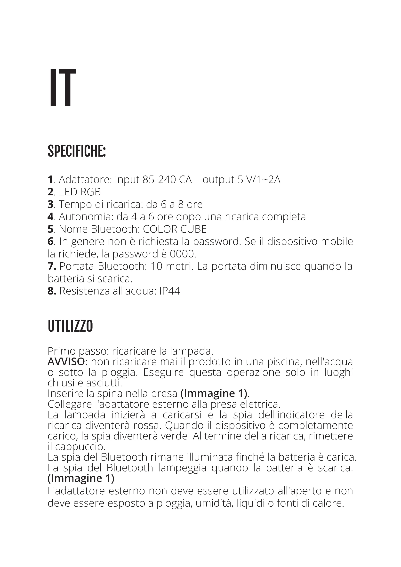 Immage 2 W SPEAKERLIGHTINGQuando Color Cube è acceso, il pulsante ON/OFF serve solo per accendere o spegnere la luce. Questo pulsante non in sulla funzione Bluetooth. Finché la batteria è carica, Color Cube ha una funzione di memorizzazione.