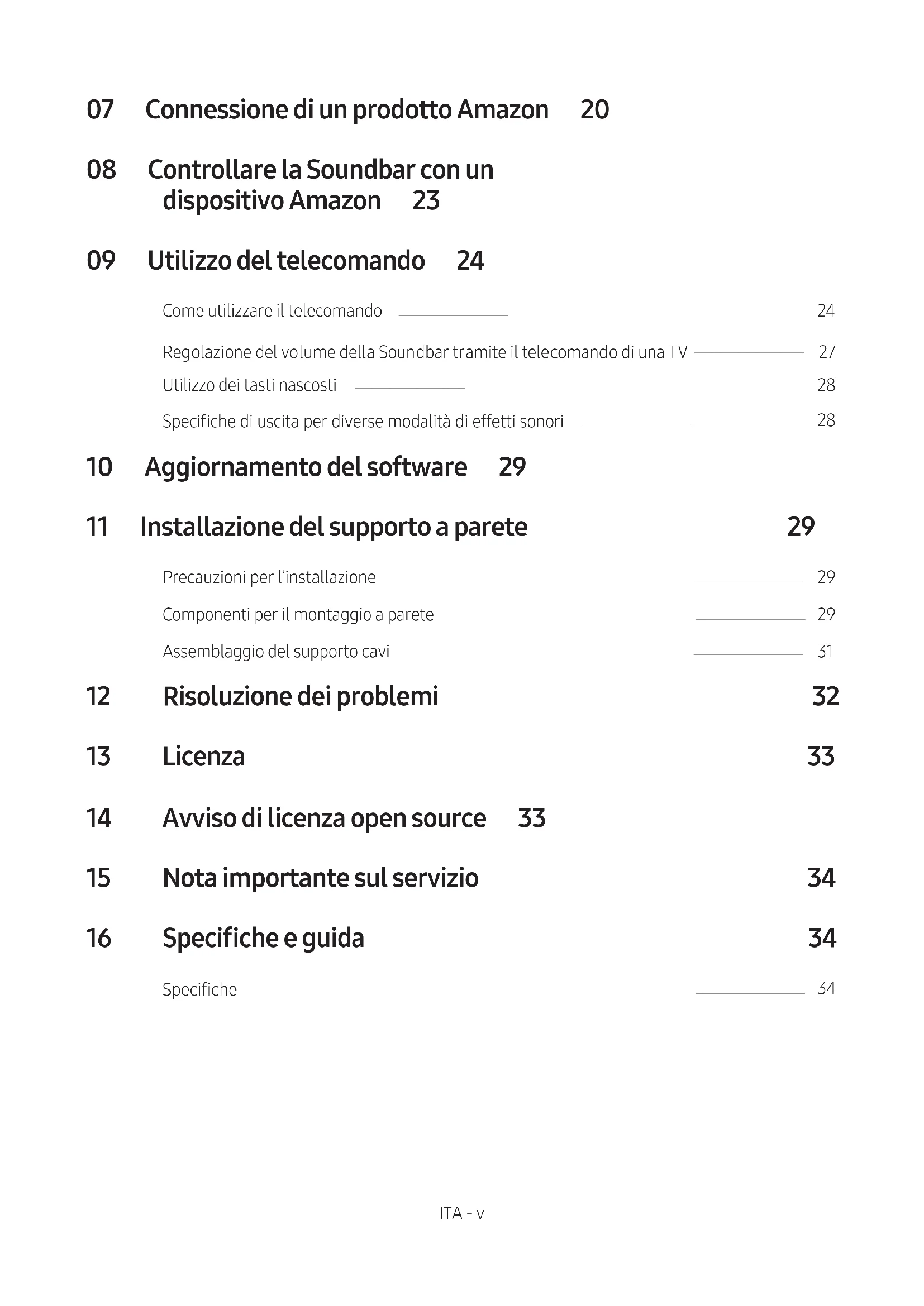 contengono sostanze chimiche dannose per l’ambiente. Non smaltirle con i comuni riuti domestici. Non gettare le batterie nel fuoco. Non cortocircuitare, smontare o surriscaldare le batterie. Una installazione scorretta delle batterie può causarne l’esplosione. Sostituire solo con batterie dello stesso tipo o equivalenti. INFORMAZIONI SUL MANUALE Il manuale utente è composto da due parti: il presente MANUALE UTENTE semplicato in formato cartaceo e un MANUALE COMPLETO dettagliato che è possibile scaricare. MANUALE UTENTE Consultare questo manuale per istruzioni di sicurezza, informazioni sull’installazione del prodotto, i componenti, i collegamenti e le speciche del prodotto. MANUALE COMPLETO È possibile accedere al Manuale completo nel Centro di supporto al cliente online Samsung effettuando la scansione del codice QR qui riportato. Per visualizzare il manuale sul proprio PC o dispositivo mobile, scaricarlo dal sito in formato documento. (http://www.samsung.com/support) Le caratteristiche, le speciche e le schermate delle app sono soggette a modiche senza preavviso.ITA - iv SOMMARIO 01 Vericadeicomponenti 2 Inserimento delle batterie prima dell’utilizzo del telecomando (2 batterie AA) ------------------------- 2 02 Panoramicadelprodotto 3 Pannello frontale / Pannello laterale destro della Soundbar ------------------------- 3 Pannello inferiore della Soundbar ------------------------- 4 03 CollegamentodellaSoundbar 5 Collegamento alla rete elettrica