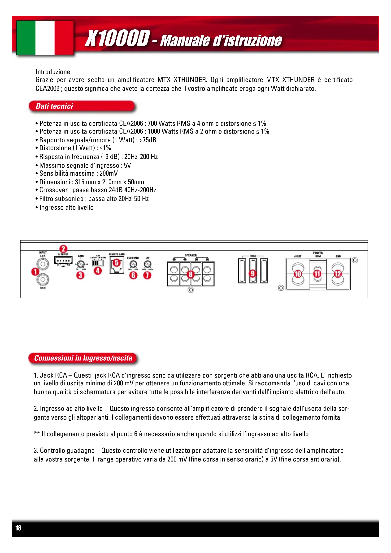 Grazie per avere scelto un amplificatore MTX XTHUNDER. Ogni amplificatore MTX XTHUNDER è certificato CEA2006 ; questo significa che avete la certezza che il vostro amplificato eroga ogni Watt dichiarato.