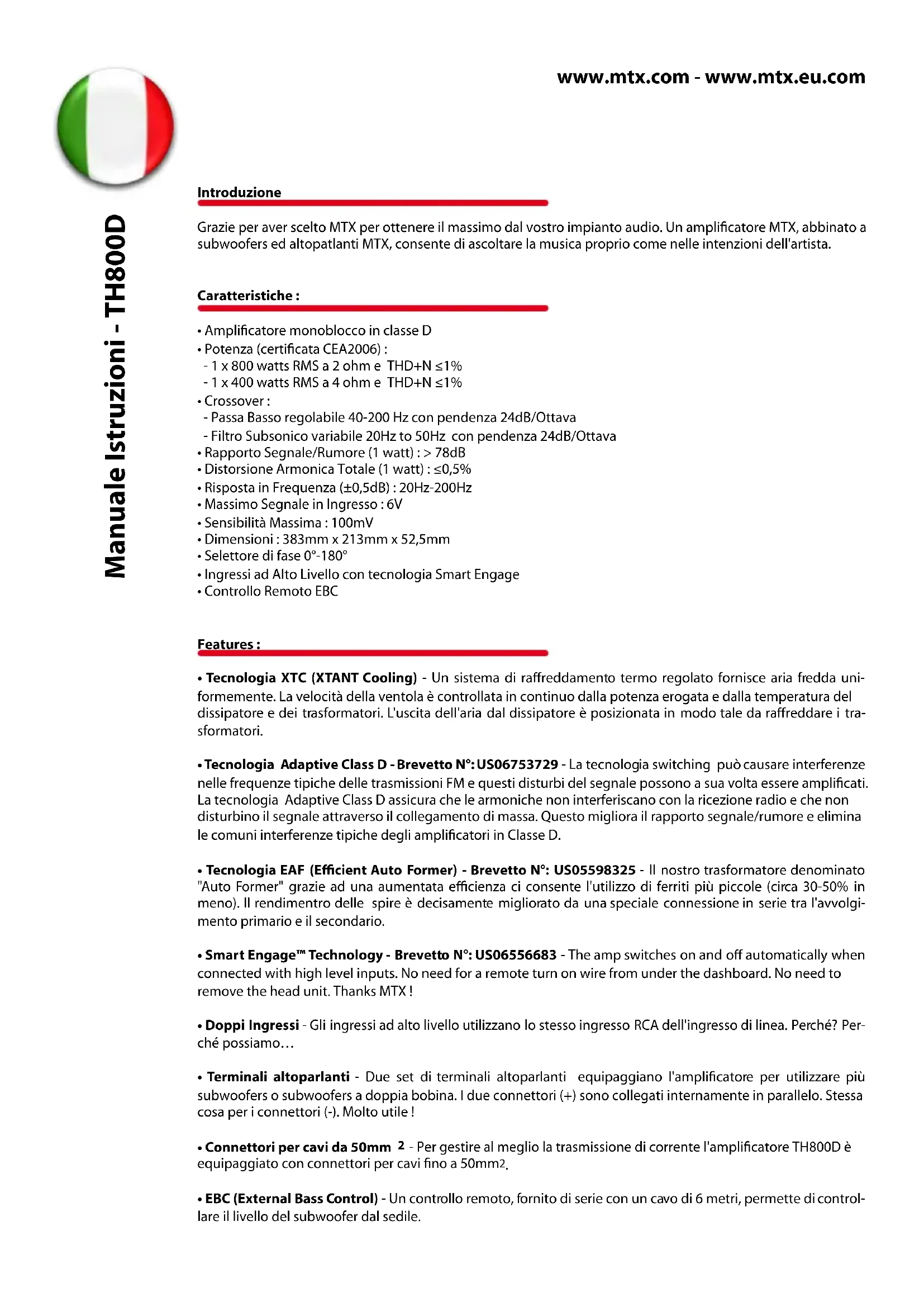 Grazie per aver scelto MTX per ottenere il massimo dal vostro impianto audio. Un amplificatore MTX, abbinato a subwoofers ed altopatlanti MTX, consente di ascoltare la musica proprio come nelle intenzioni dell'artista.