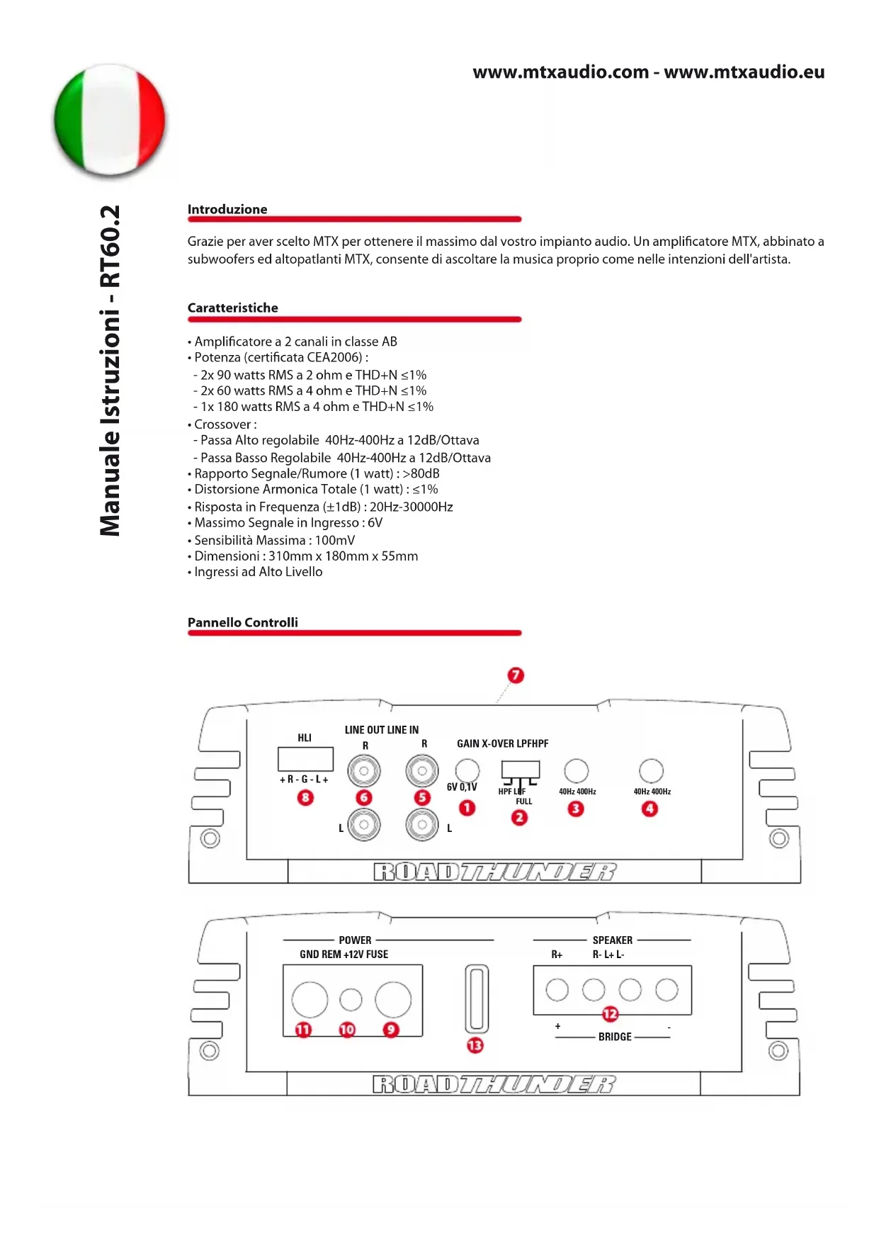 - In posizione “FULL” il crossover è disattivato. Controllo frequenze crossover passa/alto (HPF) : Serve per ssare la frequenza di crossover passa/alto desiderata (da 40Hz a 400Hz). Controllo frequenze crossover passa/basso (LPF) : Serve per ssare la frequenza di crossover passa/basso desi- derata (da 40Hz a 400Hz). Ingressi RCA (LOW INPUT) : Si utilizzano con sorgenti dotate di uscite di segnale RCA e con livello minimo di uscita di 100mV. MTX raccomanda l’utilizzo di prolunghe di segnale RCA di ottima qualità al ne di scongiurare l’ingresso di disturbi nel sistema audio. Uscite RCA (LINE OUT) : Per collegare più amplicatori ad un unico cavo RCA proveniente dalla sorgente. Led di stato : Si illumina di luce rossa continua ad amplicatore acceso e lampeggia in caso di anomalie. Ingresso alto livello (HLI) : Questo ingresso permette di utilizzarel’uscita altoparlanti della sorgente che vanno collegati direttamente all’amplicatore con il connettore fornito in dotazione. Nota : quando si utilizza l’ingresso ad alto livello deve essere usato un apposito cavo per l’accensione e lo spe- gnimento dell’amplicatore. Terminale di Alimentazione (+12V) : va collegato con un cavo di adeguata sezione al terminale positivo della batteria. Posizionare questo cavo lontano dal cavo di segnale e da altri dispositivi elettrici per evitare inetrferenze elettriche e rumori nell’impianto audio. Le connessioni ai terminali devono essere strette e sicure. Terminale di accensione (REM) : L’amplicatore si accende fornendo 12 volts a questo terminale. Terminale di massa (GND) : Va collegato (con un cavo dello stesso diametro del cavo di alimentazione) diretta- mente allo chassis della vettura rimuovendo la vernice fino a mettere a nudo il metallo. Terminali altoparlanti (SPEAKER) : Vanno collegati agli altoparlanti osservando la corretta polarità pena una resa musicale povera e bassi carenti. Modalità a Ponte : utilizzare solo il terminale positivo destro ed il negativo sinistro. ATTENZIONE : con l’amplicatore a ponte l’impedenza minima consentita è di 4 Ohm. Fusibile (FUSE) : Quando un fusibile brucia, sostituitelo con uno del medesimo valore.www.mtxaudio.com - www.mtxaudio.eu Installazione e Montaggio MTX si raccomanda di far installare i propri amplicatori da un installatore MTX autorizzato. Qualsiasi cambiamento rispetto i collegamenti illustrati può causare seri danni all'amplicatore, agli altoparlanti e/o al sistema elettrico della vettura. Controlla le connsessioni almeno due volte prima di accendere l'impianto.