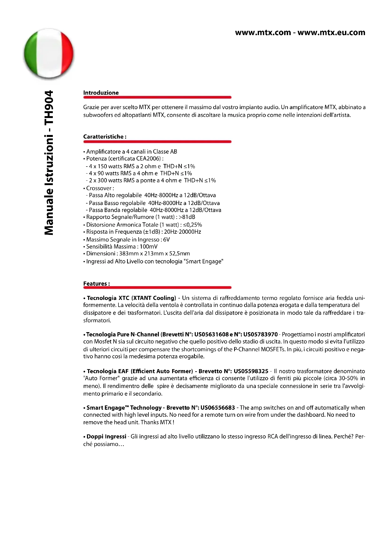 Selettore Crossover Passa Basso - Questo selettore attiva (posizione ON) o disattiva (posizione OFF) il crossover Passa Basso dell’amplicatore. Scelta del taglio di frequenza Passa Basso - Può essere scelta, tramite questo controllo, nella gamma tra 40Hz e 8000Hz. Selettore Crossover Passa Alto - Questo selettore attiva (posizione ON) o disattiva (posizione OFF) il crossover Passa Alto dell’amplicatore. Scelta del taglio di frequenza Passa Alto - Può essere scelta, tramite questo controllo, nella gamma tra 40Hz e 8000Hz. Passa Banda - Mettendo in posizione ON sia il selettore del taglio Passa Basso che quello del taglio Passa Alto, si ottiene un ltro Passa Banda. Puoi regolare l’ampiezza del ltro attraverso i controlli (3) e (5). IMPORTANTE : quando entambi i crossover sono in posizione OFF, la sezione pre è in modalità “Direct” e ore la migliore qualità audio. Accensione: il Led è rosso quando l’amplicatore è acceso. Per le protezioni termiche o di corto circuito vai ai punti 9 e 10 Pannello Controlli (Sopra) Pannello Connettori (Lato)www.mtx.com - www.mtx.eu.com Pannello Connesioni : Ingressi RCA - Da utilizzare con sorgenti con uscita di linea RCA. E’ raccoman- dabile usare sorgenti con un livello di uscita minimo di 100mV L’utilizzo di cavi di segnale RCA di buona qualità riduce la possibilità di disturbi in ingresso. Ingressi ad Alto Livello : Gli amplicatori MTX permettono un collegamento ad alto livello attraverso gli ingressi a basso livello RCA tramite l’adattatore fornito in dotazione. Terminali Altoparlanti - Collega gli altoparlanti a questi terminali, accertandoti di rispettare la polarità. Una polarità invertita provaca una perdità di bassi e/o una scarsa qualità di riproduzione sonora. Modalità a Ponte (Bridge) : Utilizzare solo il terminale sinistro positivo ed il terminale destro negativo. Non usare il modo a ponte con impedenze inferiori a 4 Ohm. Protezione Termica - il LED si accende di rosso quando l'amplicatore raggiunge i 100°C. Questo led si accende di rosso anche quando la tensione di alimentazione è inferiore a 9V o superiore a 16,2v. Protezione Corto Circuiti - Questo LED lampeggia in giallo in caso di corto circuito altoparlanti. Questo led, in assenza di segnale, lampeggia giallo quando l'uscita altoparlanti è in corto. Fusibili - quando un fusibile salta, sostituitelo con uno del medesimo valore. Terminale (+12) - Questo è il terminale di alimentazione dell'amplicatore e deve essere collegato direttamente al terminale positivo della batteria. Posiziona il cavo per questo collegamento lontano dai cavi di segnale, dai cavi antenna e da dispositivi sensibili poichè la gran quantità di corrente che passa da questo cavo può generare disturbi. E' molto importante anche eettuare connessioni strette e solide per ottenere le massime prestazioni. Per l'alimentazione del modello MTX TH904 raccomandiamo cavi di sezione non inferiore a 21mm2. Terminale Remote - L'amplicatore si accende applicando 12V a questo terminale.Solitamente la tensione è for- nita da un cavo della sorgente marcato"remote" o "antenna". Terminale di massa - Una buona connessione di massa è fondamentale per le migliori prestazioni. Utilizzare un cavo della medesima sezione di quella usata per il cavo di alimentazione e attaccarsi direttamente allo chassis della vettura, in un punto opportunamente sverniciato per mettere a nudo il metallo. Selettore di Ingresso - se la sorgente ha 4 connettori RCA (2 front+2 rear) posiziona il selettore su “4ch” collegan- do 4 spine RCA agli ingressi dell’amplicatore. Se la sorgente ha solo 2 connettori RCS posiziona il selettore su “2ch”. Manuale Istruzioni - TH904 High level inputs through RCA Adaptors included To Head Unit SpeakersInstallazione e Montaggio MTX si raccomanda di far installare i propri amplicatori da un installatore MTX autorizzato. Qualsiasi cambiamento rispetto i collegamenti illustrati può causare seri danni all'amplicatore, agli altoparlanti e/o al sistema elettrico della vettura. Controlla le connsessioni almeno due volte prima di accendere l'impianto.