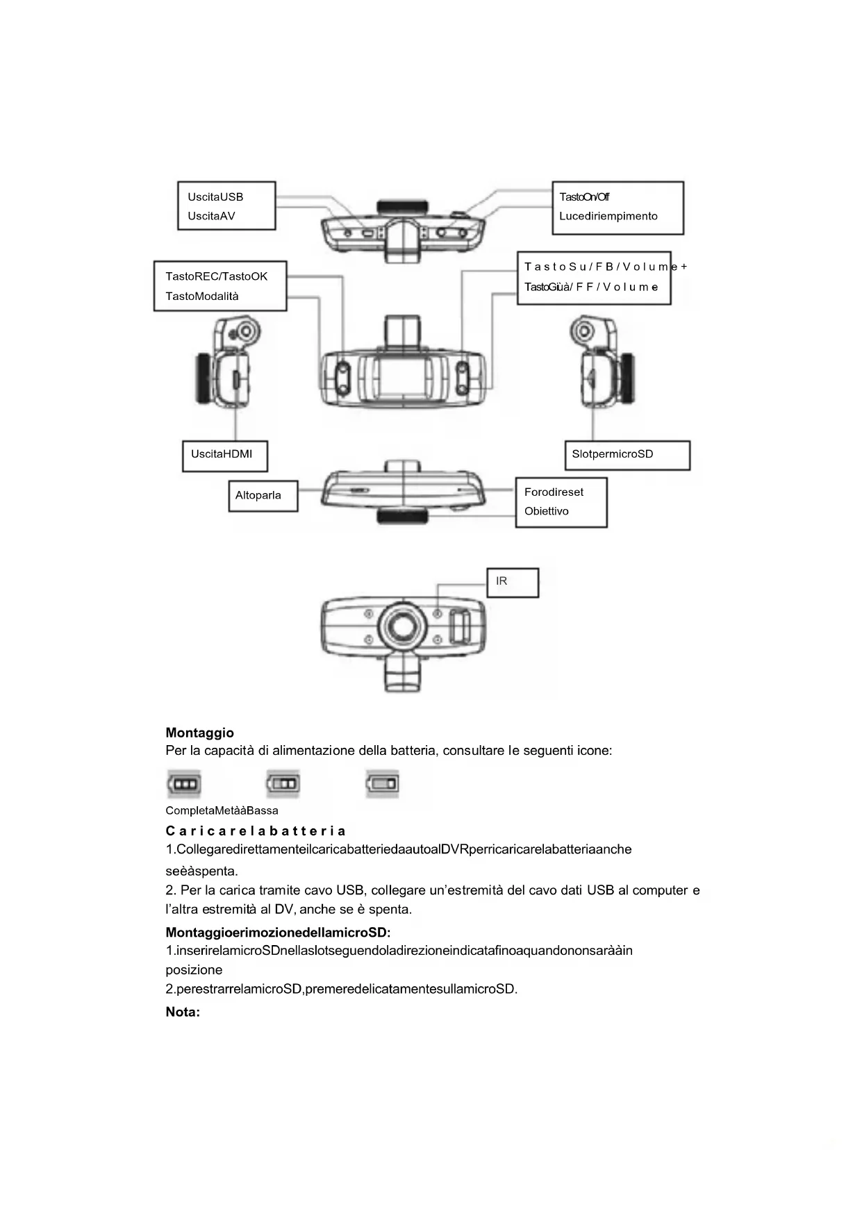 Tasto O n /O f f Luce di riempimento Uscita HDMI Foro di reset Obiettivo Slot per microSD Altoparla TastoSu/FB/Volume+ Tasto Gi - /FF/Volume -1. osservare la direzione per inserire la microSD. Se inserita nella direzione opposta la scheda potrebbe danneggiarsi.
