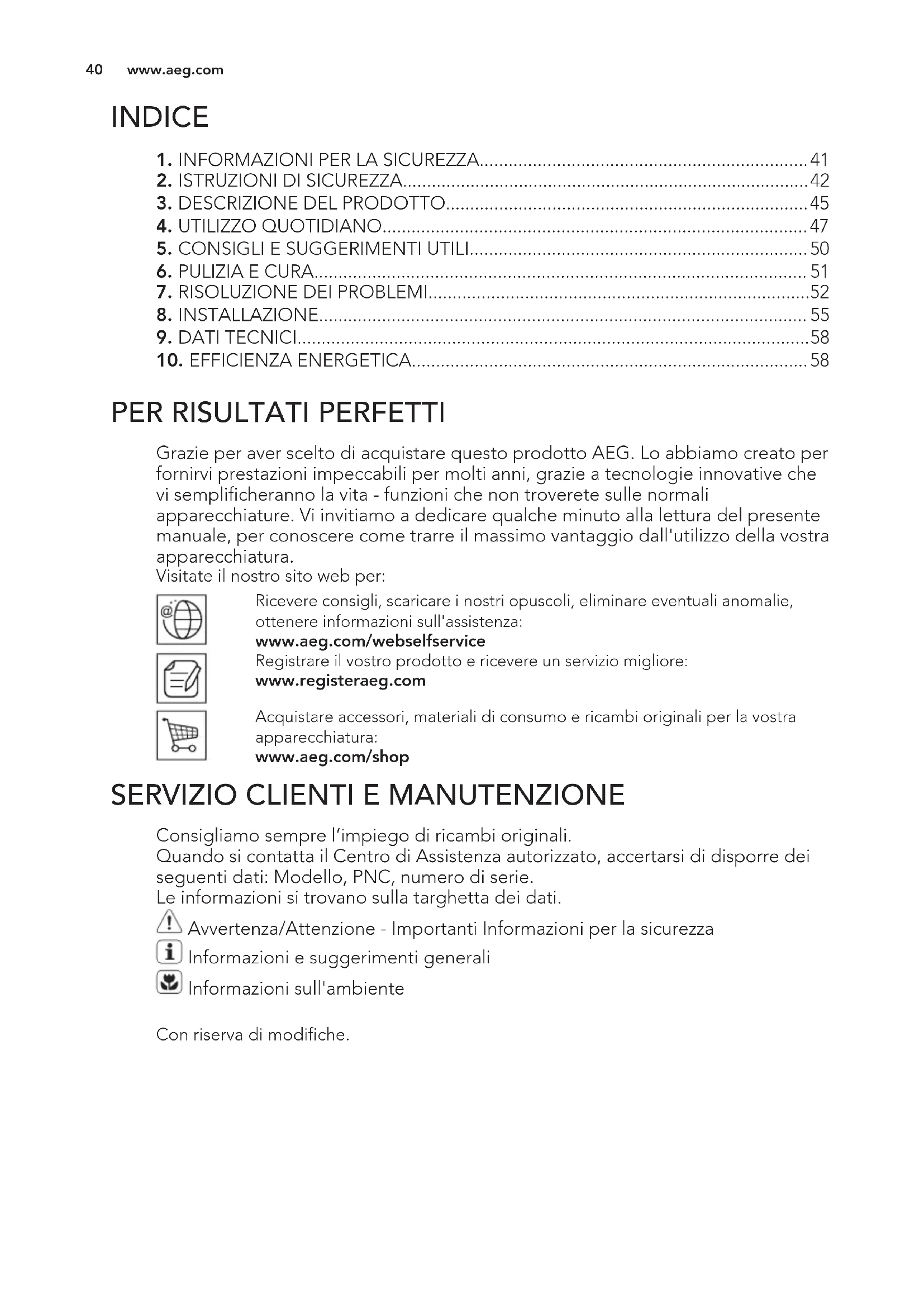 Grazie per aver scelto di acquistare questo prodotto AEG. Lo abbiamo creato per fornirvi prestazioni impeccabili per molti anni, grazie a tecnologie innovative che vi semplificheranno la vita - funzioni che non troverete sulle normali apparecchiature. Vi invitiamo a dedicare qualche minuto alla lettura del presente manuale, per conoscere come trarre il massimo vantaggio dall'utilizzo della vostra apparecchiatura. Visitate il nostro sito web per: Ricevere consigli, scaricare i nostri opuscoli, eliminare eventuali anomalie, ottenere informazioni sull'assistenza: www.aeg.com/webselfservice Registrare il vostro prodotto e ricevere un servizio migliore: www.registeraeg.com Acquistare accessori, materiali di consumo e ricambi originali per la vostra apparecchiatura: www.aeg.com/shop