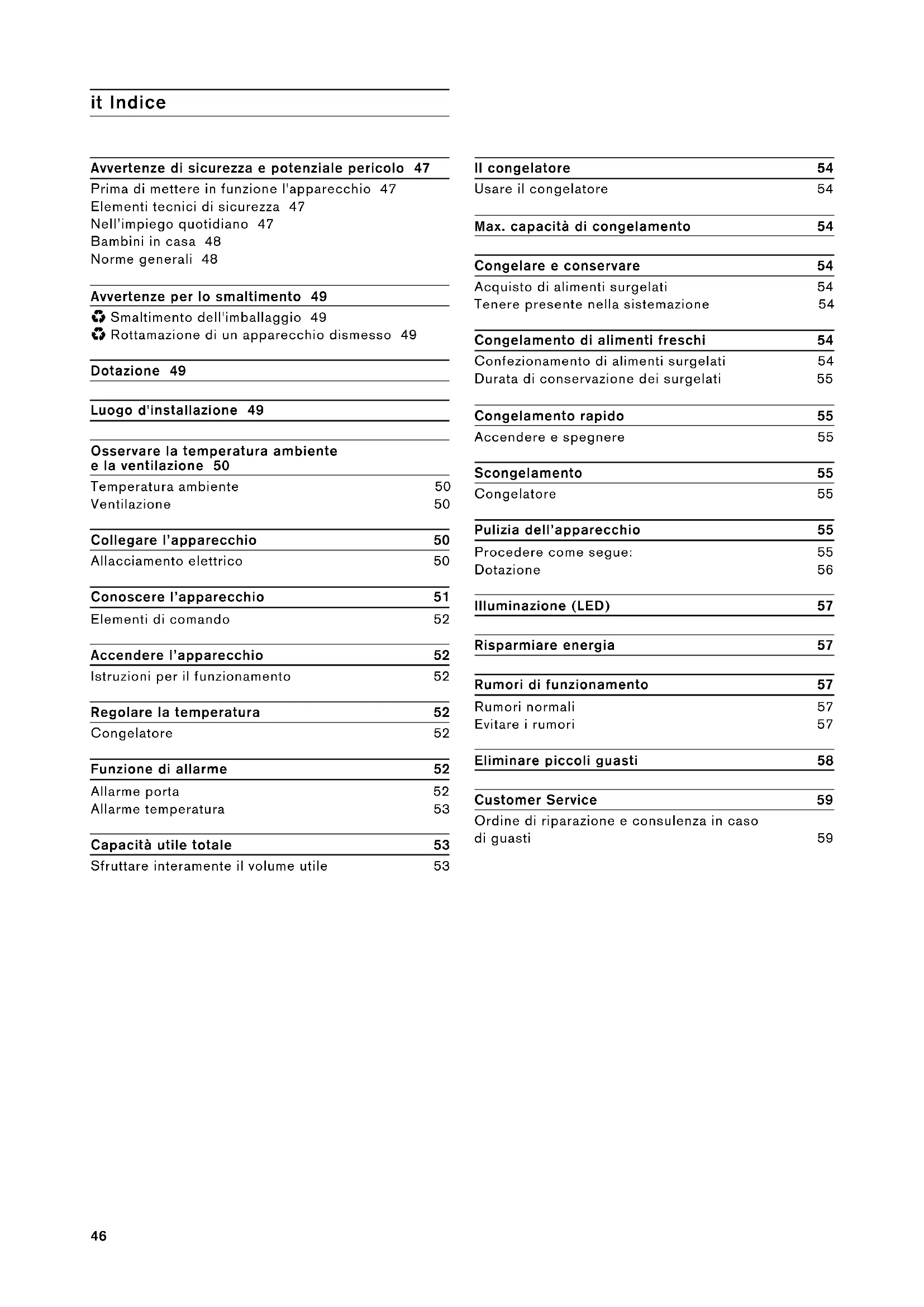 - Rottamazione di un apparecchio dismesso 49 Dotazione 49 Luogo d'installazione 49 Osservare la temperatura ambiente e la ventilazione 50 Temperatura ambiente 50 Ventilazione 50 Collegare l’apparecchio 50 Allacciamento elettrico 50 Conoscere l’apparecchio 51 Elementi di comando 52 Accendere l’apparecchio 52 Istruzioni per il funzionamento 52 Regolare la temperatura 52 Congelatore 52 Funzione di allarme 52 Allarme porta 52 Allarme temperatura 53 Capacità utile totale 53 Sfruttare interamente il volume utile 53 Il congelatore 54 Usare il congelatore 54 Max. capacità di congelamento 54 Congelare e conservare 54 Acquisto di alimenti surgelati 54 Tenere presente nella sistemazione 54 Congelamento di alimenti freschi 54 Confezionamento di alimenti surgelati 54 Durata di conservazione dei surgelati 55 Congelamento rapido 55 Accendere e spegnere 55 Scongelamento 55 Congelatore 55 Pulizia dell’apparecchio 55 Procedere come segue: 55 Dotazione 56 Illuminazione (LED) 57 Risparmiare energia 57 Rumori di funzionamento 57 Rumori normali 57 Evitare i rumori 57 Eliminare piccoli guasti 58 Customer Service 59 Ordine di riparazione e consulenza in caso di guasti 5947 m Avvertenze di sicurezza e potenziale pericolo Prima di mettere in funzione l'apparecchio Leggere attentamente tutte le istruzioni per l'uso ed il montaggio. Esse contengono importanti informazioni per l'installazione, l'uso e la manutenzione dell'apparecchio. Il produttore non è responsabile se voi trascurate le indicazioni ed avvertenze del libretto d’istruzioni per l’uso. Conservare tutta la documentazione per l'uso futuro oppure per eventuali successivi proprietari. Elementi tecnici di sicurezza Questo apparecchio contiene una piccola quantità di gas refrigerante (R600a), un gas Eco-Compatibile, ma infiammabile. Prevenire danneggiamenti ai raccordi del circuito refrigerante durante il trasporto o l’installazione dell’apparecchio. Il gas fuoriuscendo per effetto della pressione, può provocare irritazioni agli occhi. In caso di danni: ▯ tenere lontano dall'apparecchio fiamme o fonti di accensione, ▯ ventilare l'ambiente per alcuni minuti, ▯ spegnere l’apparecchio ed estrarre la spina di alimentazione elettrica, ▯ informare il Servizio Assistenza Clienti autorizzato. La quantità di gas refrigerante contenuta nel vostro apparecchio, circa 8 gr. è indicata nella targhetta d'identificazione posta all'interno dell'apparecchio. Nel caso in cui il cavo di collegamento elettrico dovesse subire danni, è necessario sostituirlo, coinvolgere il servizio assistenza clienti autorizzato o un elettricista qualificato ad eseguire questa operazione. Installazioni o riparazioni eseguite da personale non autorizzato, possono potenzialmente creare pericolo per l’utente e danni all’apparecchio. Le riparazioni vanno eseguite dal servizio assistenza clienti autorizzato Le riparazioni vanno eseguite dal servizio assistenza clienti autorizzato o da personale qualificato ad eseguire questa operazione. È consentito usare solo parti di ricambio originali del costruttore. Solo con l’impiego di detti componenti il costruttore garantisce che i requisiti di sicurezza del prodotto siano rispettati. Il prolungamento del cavo elettrico di alimentazione deve essere eseguito dal servizio assistenza clienti autorizzato. Nell’impiego quotidiano ▯ Non introdurre mai apparecchi elettrici nell’interno di questo elettrodomestico (es. apparecchi di riscaldamento, produttori di ghiaccio elettrici ecc.). Pericolo di esplosione! ▯ Non sbrinare o pulire mai l’apparecchio con una pulitrice a vapore. Il vapore può raggiungere parti elettriche e provocare un cortocircuito. Pericolo di scarica elettrica! ▯ Non utilizzare oggetti appuntiti o affilati per rimuovere la brina o il ghiaccio. E’ possibile danneggiare i raccordi del circuito refrigerante, che rende inservibile l’apparecchio. Il gas fuoriuscendo per effetto della pressione, può provocare irritazioni agli occhi. ▯ Non conservare nell’apparecchio prodotti contenenti propellenti gassosi combustibili (per es. bombolette spray) e sostanze infiammabili. Pericolo di esplosione! ▯ Non usare impropriamente lo zoccolo, i cassetti estraibili, le porte ecc. quale punto di appoggio o come sostegno. ▯ Per lo sbrinamento e la pulizia estrarre la spina d’alimentazione o disinserire l’interruttore di sicurezza. Evitare di esercitare trazioni sul cordone elettrico, ma impugnare correttamente la spina. ▯ Conservare alcool ad alta gradazione in un contenitore ermeticamente chiuso, e posto in posizione verticale. ▯ Evitare che olii o grassi imbrattino parti plastiche o le guarnizioni delle porte. I grassi aggrediscono il materiale plastico e la guarnizione della porta diventano fragili e porose.48 ▯ Non ostruire le aperture di passaggio dell’aria di aereazione dell’apparercchio. ▯ Evitare pericoli a bambini e persone a rischio: Sono esposti a pericolo i bambini e le persone con limiti fisici, psichici o percettivi ed altresì persone, sprovviste di sufficiente conoscenza del sicuro funzionamento dell'apparecchio. Accertarsi che i bambini e le persone a rischio abbiano ben compreso i pericoli. Una persona responsabile della sicurezza è tenuto a sorvegliare o istruire i bambini e le persone a rischio in rapporto con l'apparecchio. Permettere l’uso dell’apparecchio solo a bambini in età di 8 anni o superiore. Sorvegliare i bambini durante la pulizia e la manutenzione. Non permettere che i bambini giochino con l'apparecchio. ▯ Non conservare nel congelatore liquidi inbottiglia e lattine (specialmente le bevande contenenti anidride carbonica). Bottiglie e lattine possono rompersi! ▯ Non mettere in bocca alimenti congelati appena presi dal congelatore. Pericolo di ustioni! ▯ Evitare il contatto prolungato delle mani con alimenti congelati, ghiaccio o i raccordi dell’evaporatore ecc. Pericolo di ustioni! Bambini in casa ▯ Non abbandonare parti dell'imballaggio ch