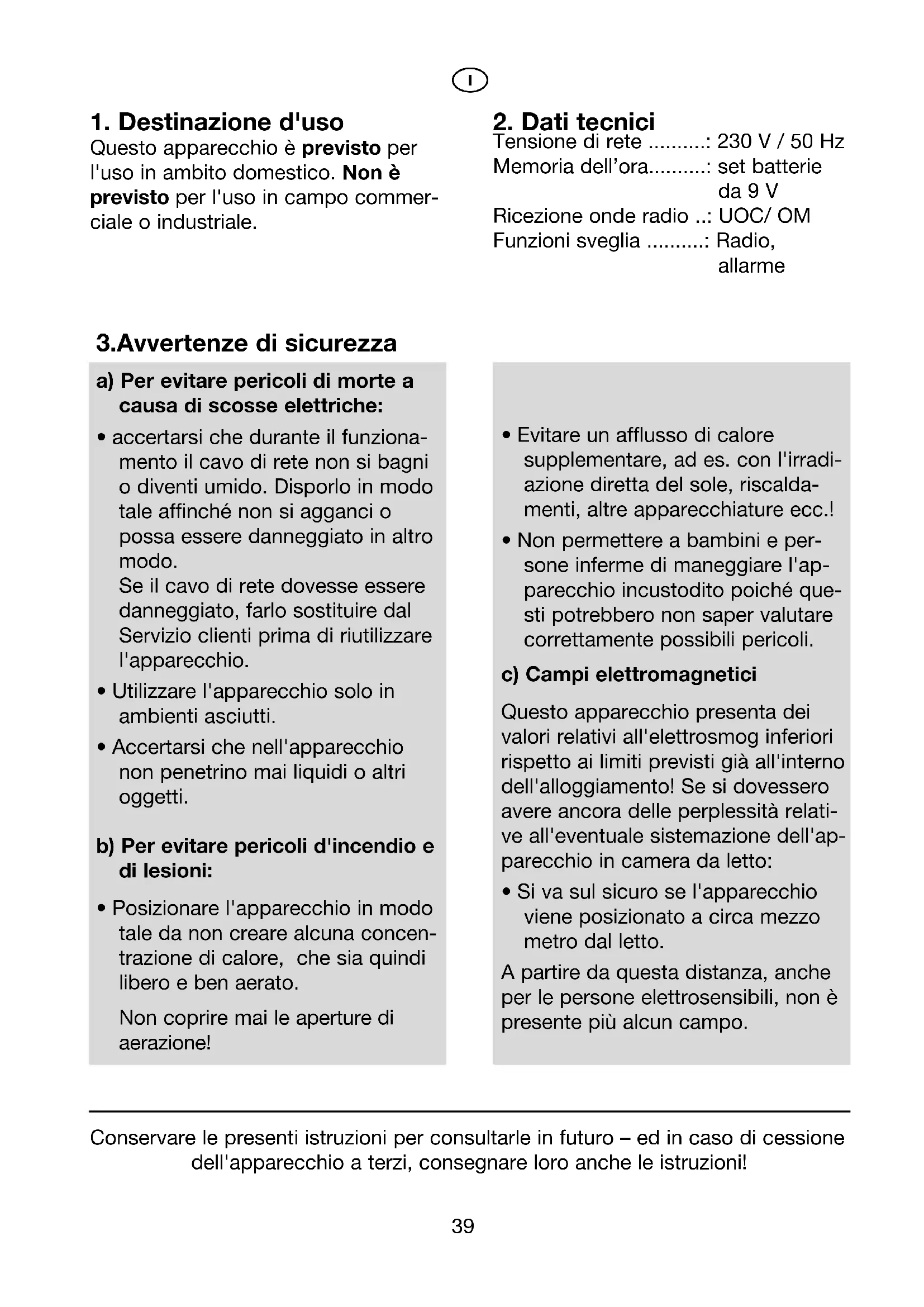 Tensione di rete ..........: 230 V / 50 Hz Memoria dell’ora..........: set batterie da 9 V Ricezione onde radio ..: UOC/ OM Funzioni sveglia ..........: Radio, allarme Conservare le presenti istruzioni per consultarle in futuro – ed in caso di cessione dell'apparecchio a terzi, consegnare loro anche le istruzioni!